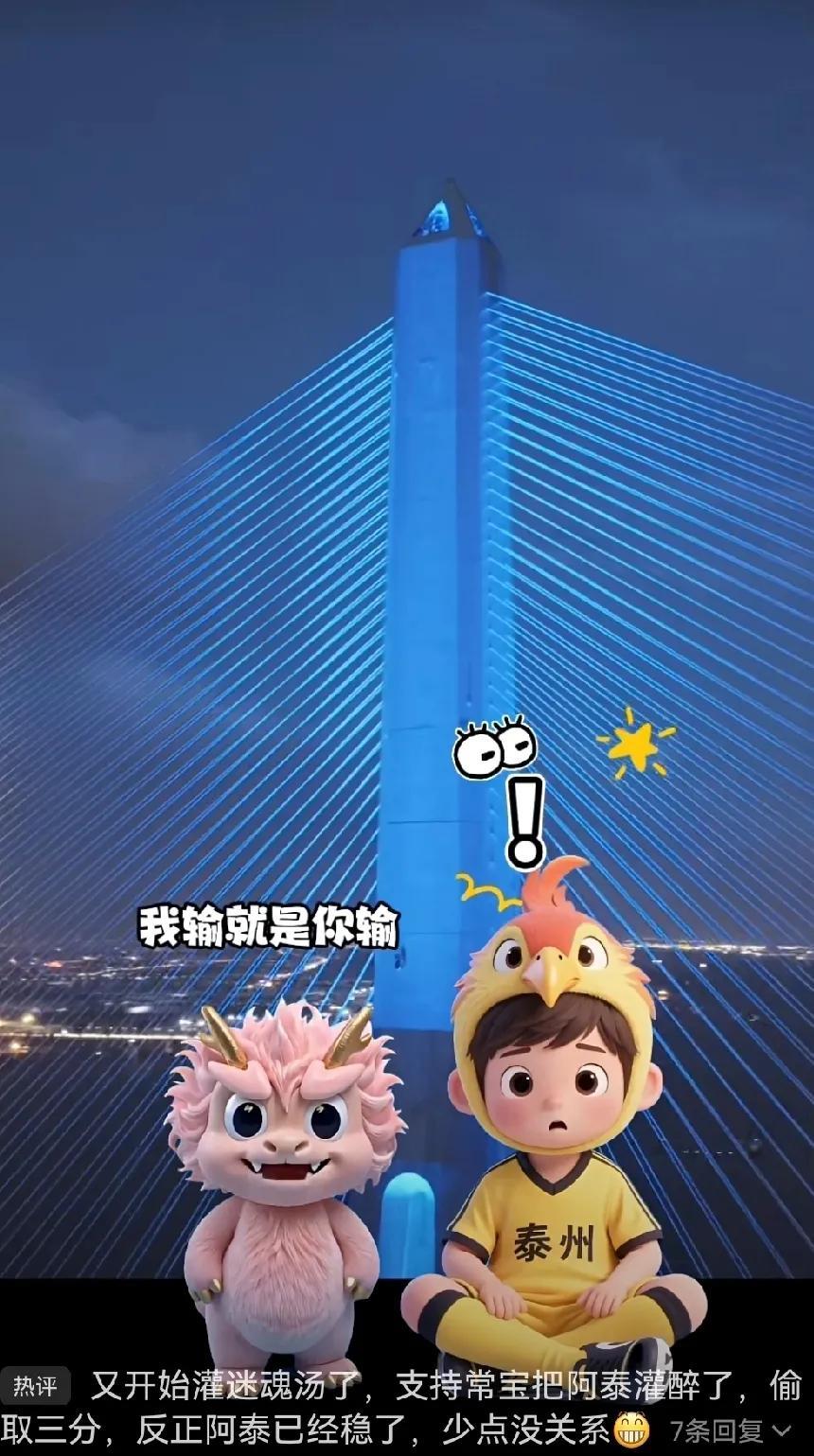 明天常宝与阿泰开始苏超龙凤之战,常宝:阿泰,我们有大桥相连,是一体的,你赢就是我赢,我输就是你输。 这迷魂汤灌的[捂脸][泣不成声][赞] (相关信息和图片来源于文旅常州)