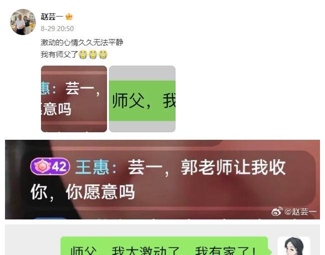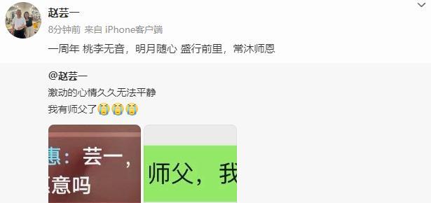 赵芸一拜师一周年,发文说道:“一周年,桃李无音,明月随心,盛行千里,常沐师恩。”