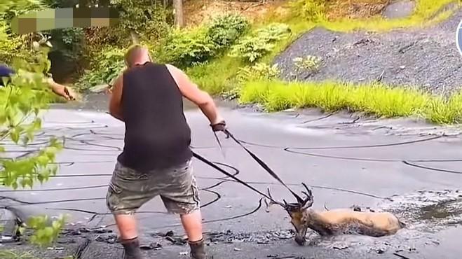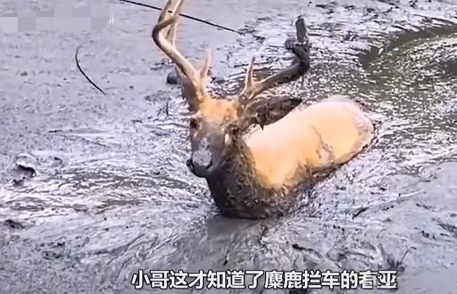 万物皆有灵!一条公路上,突然蹿出来一只健壮的麋鹿,见到路上的过路车辆,它立马冲上前想把车逼停。车主见状赶紧停下车。谁知这只麋鹿并没有攻击这个车意思,一直在车前点着头,似乎想向人传达什么意思。但这个车主看到如此健壮的麋鹿,也不敢贸然下车,最后竟然趁着麋鹿不注意,一脚油门“逃走了”。 好在,功夫不负“有心鹿”,终于有个小哥发现了麋鹿的不对劲,停车下去查看。果然小哥发现了问题,原来这个麋鹿的孩子掉进了旁边的淤泥里,困在里面根本无法挣脱。 小哥见状赶紧找来了绳子,将绳子套在小鹿的角上,用力往上拉。但由于小鹿陷的太深了,即使小哥用很大力气,小鹿出来也非常缓慢。好在,小哥没有放弃,就这样一点点向外拉,经过半小时,小鹿终于被拉上来获得了自由。 真是“万物皆有灵”,谁能想到麋鹿也会向人求救。也要谢谢有爱的小哥,一鹿有你,一定会一鹿平安!