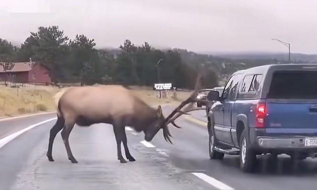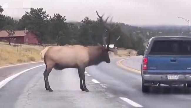 万物皆有灵!一条公路上,突然蹿出来一只健壮的麋鹿,见到路上的过路车辆,它立马冲上