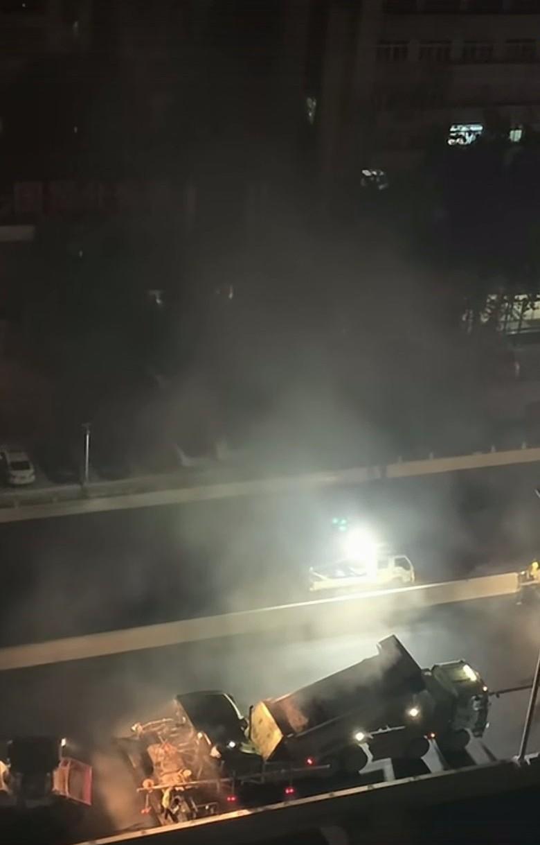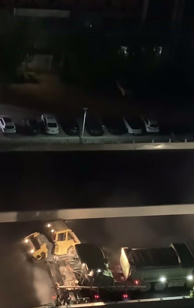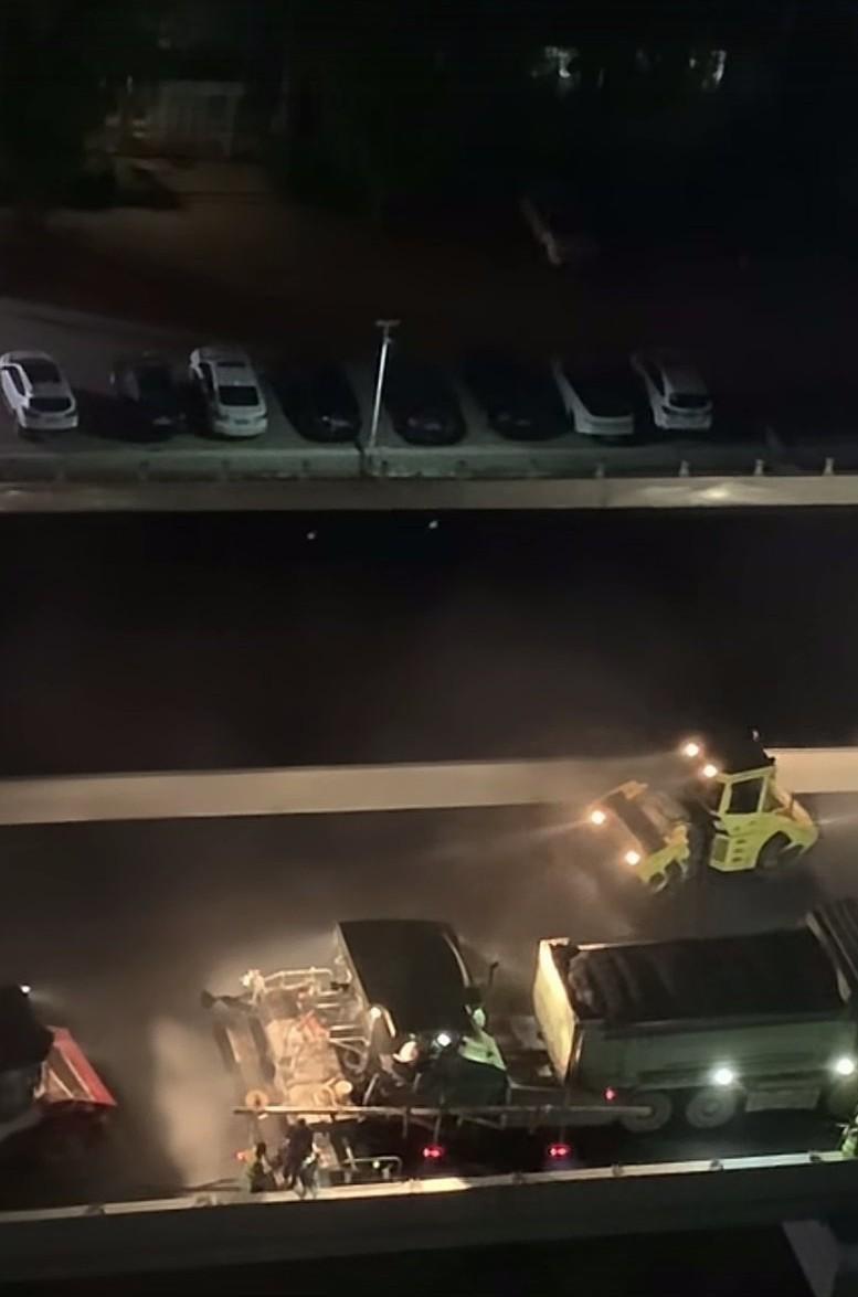 路过石家庄市和平路高架桥,发现这儿正干得热火朝天呢!原来在铺第二茬沥青,而且夜车