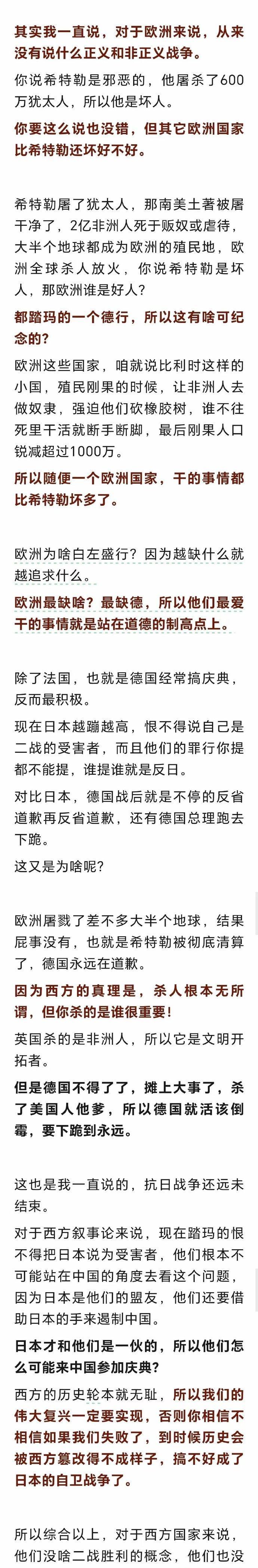 这些国家为什么都不来?坏土豆的分析非常有道理。 纪念时间不同,投降的对象也不同。欧洲国家在5月8号,名字叫欧洲胜利日。这天是德国纳粹投降的日子。 我们纪念的是日本签署投降书的日子,日期是9月2日。只不过消息传到国内得以确认的时候已经是9月3日了,所以就把这天作为抗战胜利纪念日。我们打败的是日本。 日本现在是西方的盟友,他们恨不得帮日本把过去的侵华历史洗白,不可能来参加这样的纪念活动。 圈子不同,价值观不一样,大家各玩各的,没有必要生拉硬扯搅在一起。我们的活动他们不来,他们的活动我们也不去。没什么大不了的。 文章写得非常好。以上只是省流版,详情请阅读坏土豆的文章,我只是个搬运工。