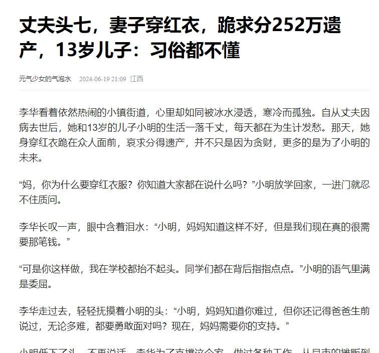 湖南,男子中风,又不幸患癌,妻子见日子没盼头,抛夫弃子去外面独自快活,丈夫头七还没过,女子回家发现儿子不见了,丈夫的身份证和银行卡都不知去向,婆家人不让她插手丈夫的丧事,252万征收款下落不明,邻居们背地里议论纷纷。 在湖南一个普通家庭里,男人突然中风偏瘫,接着又查出癌症,妻子觉得生活没希望,就扔下丈夫和儿子出去逍遥。丈夫去世头七都没过,她回家一看儿子不见了,丈夫的身份证和银行卡也没影儿,婆家人不让她管丧事,252万征收款去向不明,邻里私下议论得沸沸扬扬。这事听起来像小说,但现实往往更扎心,到底钱去了哪儿?儿子怎么了?往下看就知道。 这个故事的主角是蔡坤和付东梅夫妇。蔡坤是湖南农村出来的,高大健壮,脸庞方正,皮肤被太阳晒得黑黑的。从小他就帮家里干农活,长大后进城打工,在建筑工地搅拌水泥,双手长满老茧。工友递烟他不接,就专心干活。他工资不高,但总按时寄回家,靠谱得很。付东梅是城镇姑娘,长相亮眼,头发烫卷,爱穿花裙子。 在工厂上班,下班喜欢逛街买化妆品。两人通过工友介绍认识,很快就互生好感,没多久结婚。婚礼简单,在村里搭棚请亲戚吃饭。生下儿子小明后,一家三口过着平凡日子。蔡坤早出晚归,回家脚上带泥,付东梅拖地擦拭。儿子学走路时,他蹲下接住孩子。初期生活还稳当,但渐渐付东梅嫌弃起来。她觉得丈夫木讷,不会哄人,两人争执越来越多。 为饭菜凉了敲碗,为小事甩门。蔡坤继续上班,爬梯子钉梁,风吹乱头发。付东梅上班迟到被扣钱,甩包出门。夫妻话少,儿子上学他挥手道别。日子就这样一天天过,表面平静,底下裂痕越来越大。话说回来,婚姻本就靠互相体谅,可付东梅心高,总想更多浪漫,蔡坤忙工作,顾不上这些小事。这也反映了不少农村进城夫妻的现实,生活压力大,感情容易淡。 蔡坤发病是突发的事。在工地干活时左手无力,东西掉地,工友扶他去医院。诊断中风偏瘫,左半身动不了。回家后付东梅端水擦身,喂饭换尿布。每天重复这些,家里的异味散不去。她辞职照顾,脸色越来越差。几个月下来,抱怨声大。接着检查出癌,肿瘤扩散。家开销猛增,她卖首饰凑钱。照顾丈夫需要全天候,她推轮椅出门。争吵升级,有天她收拾行李走了,扔下丈夫和12岁儿子。离家两年,婆家兄弟姐妹轮流帮忙。 三哥带菜上门,四姐擦地帮翻身。儿子放学回家帮忙端水。蔡坤病情恶化,兄弟围床安慰。他去世时,亲戚办丧事简朴,下葬山坡。付东梅没参加,婆家人不让她插手,说她早不管家,现在也别来。头七没过,她返回。开门客厅空荡,喊儿子没应。儿室衣物不见,抽屉里丈夫身份证和银行卡没了。她跑去三哥家,三哥跨车走人。三嫂晾衣不理她。 252万征收款不知去向,邻居墙后低语,目光避开。征收款本是房子被征的好消息,但现在成谜。婆家人说钱给孩子保管,有账单记录。她自知抛下重病丈夫不对,但还想分钱。这事接地气,很多家庭遇到病祸,亲情就露真章。付东梅的行为让人摇头,她没尽妻子责任,法律上虽有继承权,但道德上说不过去。蔡坤生前最信任大侄女,委托她管钱。买房装修落儿子名,存钱给将来结婚,剩52万日常用。每一笔清清楚楚。她看到照片证据,自知理亏,辩解是找依靠。最终同意52万给她管,作为母子生活费。 后续发展里,她找到儿子,他守孝三天,已回婆家。她拉他去坟地,他站远处不近前。她责怪婆家人挑拨,儿子不理。问款项,全家聚客厅,账本摊开。大侄女点数字,房产证写儿子,存折清晰。剩款作花费。她伸手要,三嫂甩照片,她捡起看。承诺管好儿子,钱用学习上。法律角度,她没离婚,有继承权,第一顺位。抛下丈夫违扶养义务,违公序良俗。但遗产可分。她须抚养未成年儿子,教育保护责任在。 最终52万交给她,出门脚步匆忙。这结局现实,钱分了,但亲情裂了。儿子淡定,没太大感情波动,可能是两年缺失造成的。婆家人帮忙两年,轮流照顾,体现血脉亲情。邻居议论,反映社会眼光。征收款252万,本该救家,现在成争端。蔡坤生前花100多万买三居室装修,存100万给儿子结婚,剩52万生活。账单每笔记详尽。她保证钱用正途,但信任已失。这事有内涵,婚姻不是只图快活,责任重于一切。付东梅不思悔改,觉得婆家坏话多,儿子疏远她。现实中,这种抛弃行为常见,病祸考验人性。 你对这个故事有啥看法?妻子行为对不对?征收款该怎么分?欢迎评论区留言分享你的观点,大家一起讨论讨论。