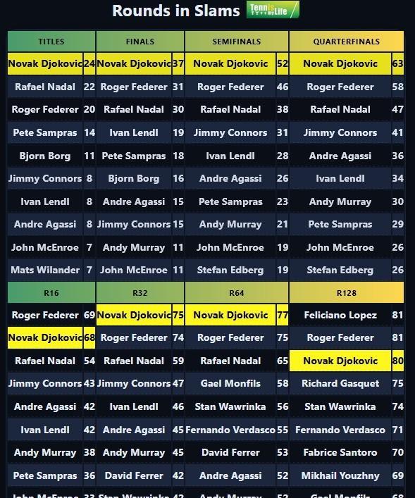 看这大满贯各轮次的战绩表,德约科维奇真的杀疯了! 冠军数24个一骑绝尘,决赛、半决赛、八强次数也都是他领跑。 再看低轮次,R32、R64次数他也稳居前列,R128也有不错表现,感觉可以轻松突破费德勒、纳达尔的数据… 德约这统治力,难怪是GOAT级别的存在,太强了! #晒图笔记大赛#