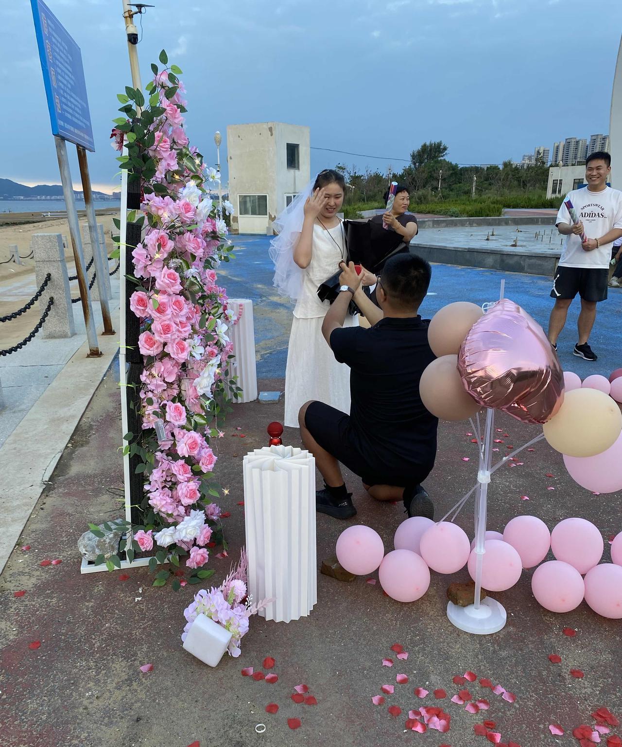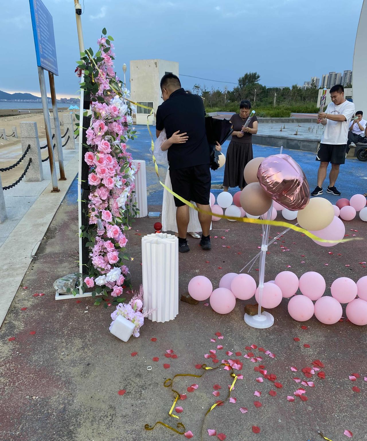 她都哭了…… 昨天七夕节,儿子说,他同学要在晚上跟女朋友求婚,让我们去见证一下。 他同学婚期都定了,定在十月二号。以前年轻人特别重视2月14的情人节,今年儿子他们都没过。原来是开始看重七夕节了。 他们安排在夹河那里,边看着海景边吃着烧烤,边聊着家常,我和老公一起去凑个热闹。 儿子的同学心很细,做事很周全。他的女朋友是安徽的,两个人在高中时在网上认识的,已经谈了十年了,终于修成正果。不容易! 趁着七夕节,儿子的同学要给女朋友一个惊喜,他要设计一个求婚仪式。他背着女朋友准备了好几天,下午布置了一下午的场地。 仪式的开始,他叙说了他们从相遇到相识,从相识到相知,从相知到相爱的过程,他女朋友都激动的哭了,最高潮时他单膝下跪为她带上了象征着爱情的钻戒。 有鲜花,有美酒,有蛋糕,有烟花,有来自父母和大家的祝福,大家都为她们感到高兴,祝福他们!祝他们永远幸福,白头到老! 因为回来太晚了只能今天早上发了。#头号创作者激励计划#