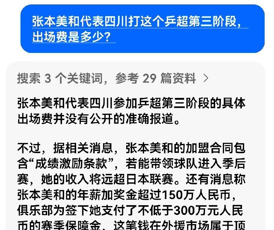 张本美和为什么加盟四川队? 1、队服好看。四川成都若水居的比赛服,设计感十足,拿给国家队穿都没问题。 2、美食诱惑。张本美和血液里富含红油,四川火锅能一秒入魂,直达灵魂深处。 3、钞能力。张本美和世界第六,外协会中排名最高。四川队没少破费,但具体不详,AI倒是什么也敢说,给了具体数字,见下图,权当娱乐。 4、近期没有更肥的比赛,得空。