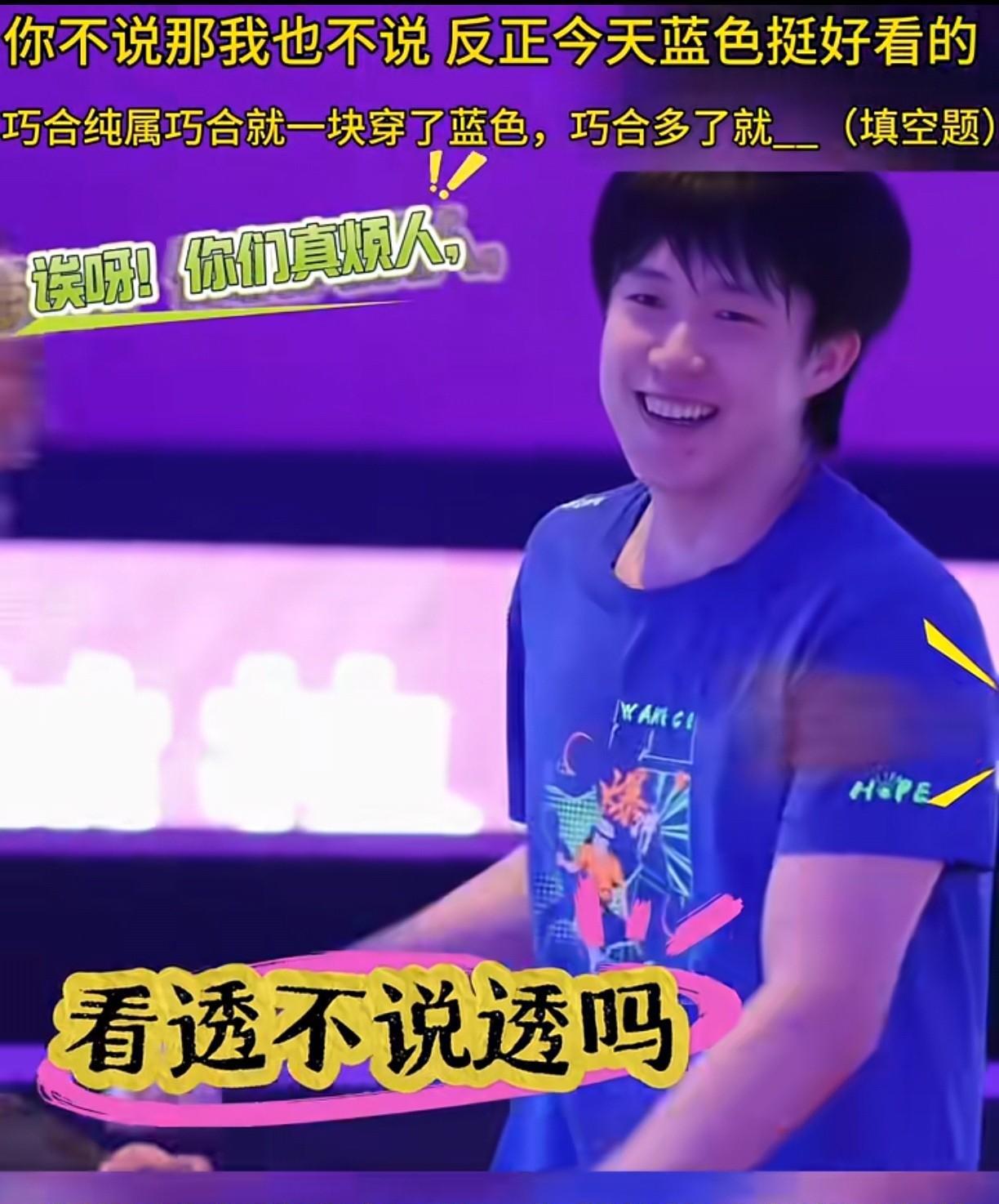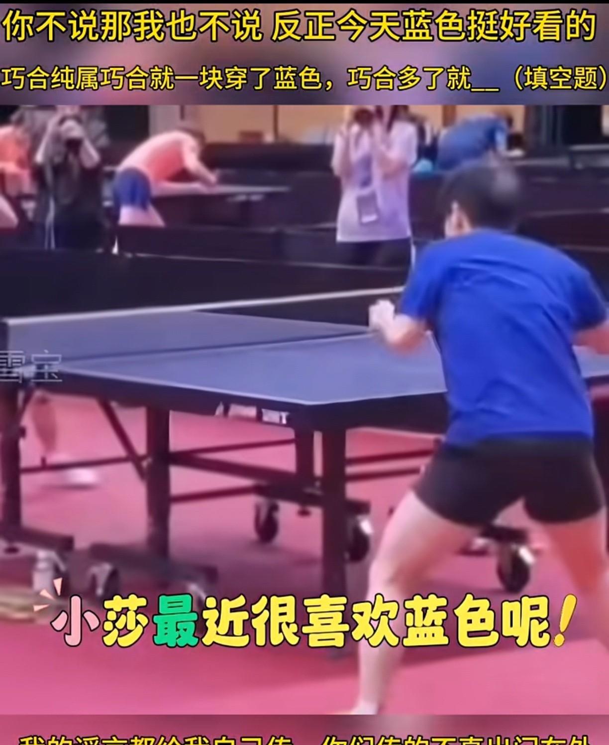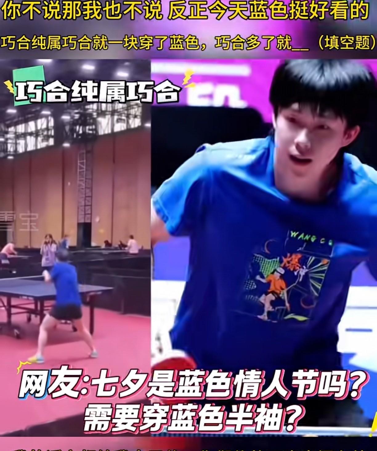 要说网友全才还真全才!这不,乒超联赛第三阶段新疆比赛第一天,恰逢七夕,头哥和队友训练的照片都找出来了! 真是马到成功旗开得胜,王楚钦代表的山东魏桥,一日双赛,都是3/0轻松赢下。 其中一场是山东魏桥3/0福建安井 还有一场是山东魏桥3/0上海地产。 头哥在3/0李天阳后,又3/0孙正,虽说赛前还说状态不是太好,但一到赛场,小狮子王的勇猛就锐不可当啦。 但大家关注的焦点似乎并不仅仅在比赛。这不!就有网友爆料说,七夕这天,莎莎和队友都穿蓝色队服呢! 莎莎最近也很喜欢蓝色,你不说我不说,反正蓝色挺好看。巧合了不是。别多想哈! 新疆粉丝应援牌全是情侣装,看图五喜庆不?还有人看热闹不嫌事大—— 说我的谣言都给我自己传,你们传的不真。出门在外,名分都是自己挣的,你不说我不说我们一起暗戳戳。 哈哈哈,反正大家看着开心就好!至于其他,时间总会告诉你答案的。 #我的宝藏兴趣#