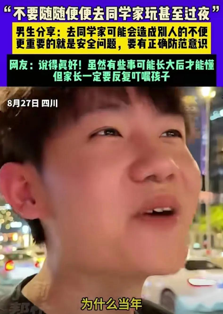 男老师火了,他发视频告诫自己的学生,不要随便到别人家去玩,更不要在别人家过夜。 他说小时候不理解父母为什么不让他去同学家玩,认为父母控制欲太强。现在长大了当了老师才明白父母这样做的苦心。 他说虽然是同学主动邀请你去玩,但不代表人家的父母也欢迎你,人家父母忙于工作哪有时间来照顾你?或者人家家里老人爱清静,你们去玩,表面上人家欢迎,但是心里却不一定这样想。 更重要是安全问题。现在很多孩子不懂这个道理,大家一定要有正确的防范意识,特别是女同学不要轻易去同学家玩,更不要在同学家过夜。实在要去同学家玩,也得将相关信息给父母通报一下,特别是联系方式,这样才能确保安全。 很多网友认为他说得很对,尤其是对年龄不算很大的孩子,既不能让他去同学家玩,也不能让他带同学来家里玩,这样做对大家都好,可以避免许多麻烦。 也有网友认为他的观点很偏颇。同学之间相互走动,互相串门,没什么不好的,没有这么恐怖,不仅没有他想象的那些事情发生,反而会增进同学间的友谊,锻炼学生的交际能力。是一件非常好的事情,他故意夸大其词,目的就是为了省事,让自己的学生各自呆在家里,这样他就会少“操心”。