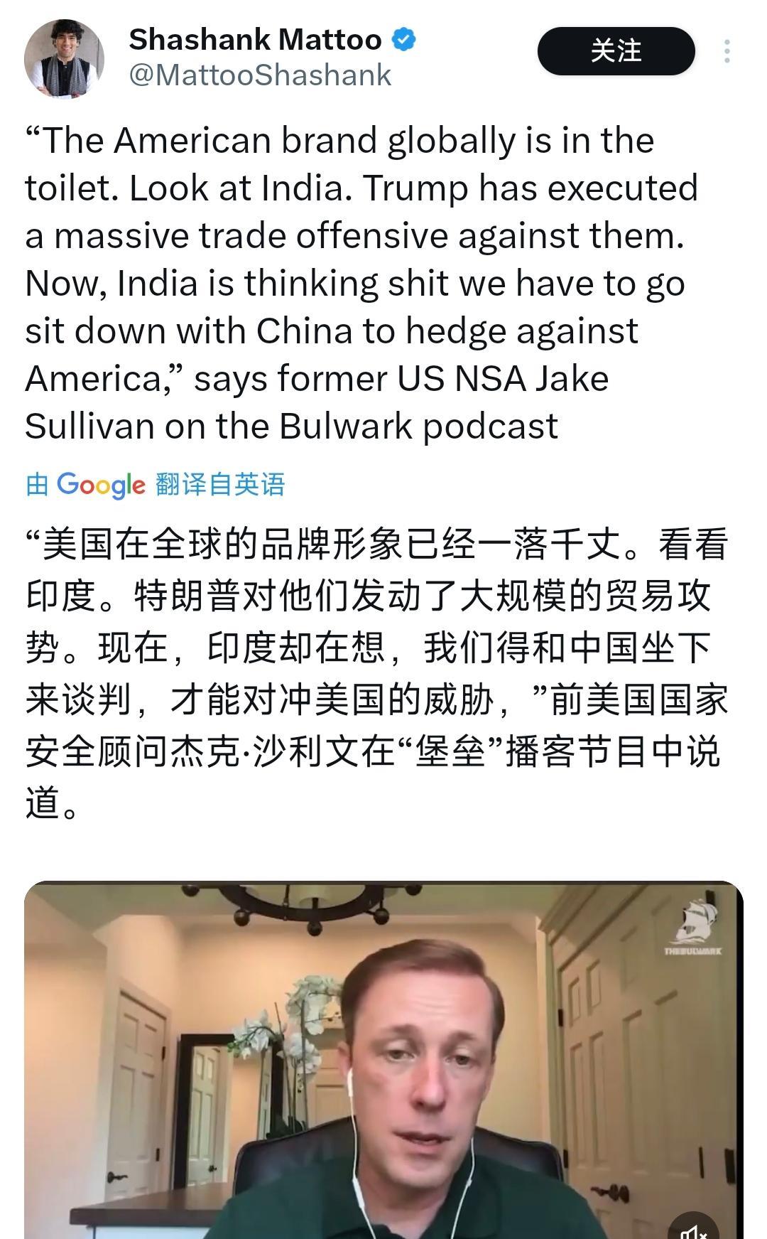 拜登的国家安全顾问杰克·沙利文:“美国在全球的品牌形象已经一落千丈。看看印度。特朗普对他们发动了大规模的贸易攻势。现在,印度却在想,我们得和中国坐下来谈判,才能对冲美国的威胁。”——杰克·沙利文今天(北京时间8月31日)在“堡垒”播客节目中说道。 [机智]评几句:短短半年时间,印度从拜登眼里的香饽饽和拉拢对象,变成了特朗普口中的“扶不起的烂国”和“死亡经济”。这种情况下,印度当然需要考虑其他选项,并依靠其他大国来平衡美国带来的压力。一位印度网民的留言很有代表性:“现在看来,时代似乎不可能逆转。特朗普的顾问们已经破坏了局势,给了中国加强其地缘政治地位的机会。不仅是印度,许多国家都在重新考虑美国以外的选择。这可能是中国超越美国成为领先大国的转折点。美国政府的战略或许会被证明是其历史上最大的错误之一。”(如图四所示)