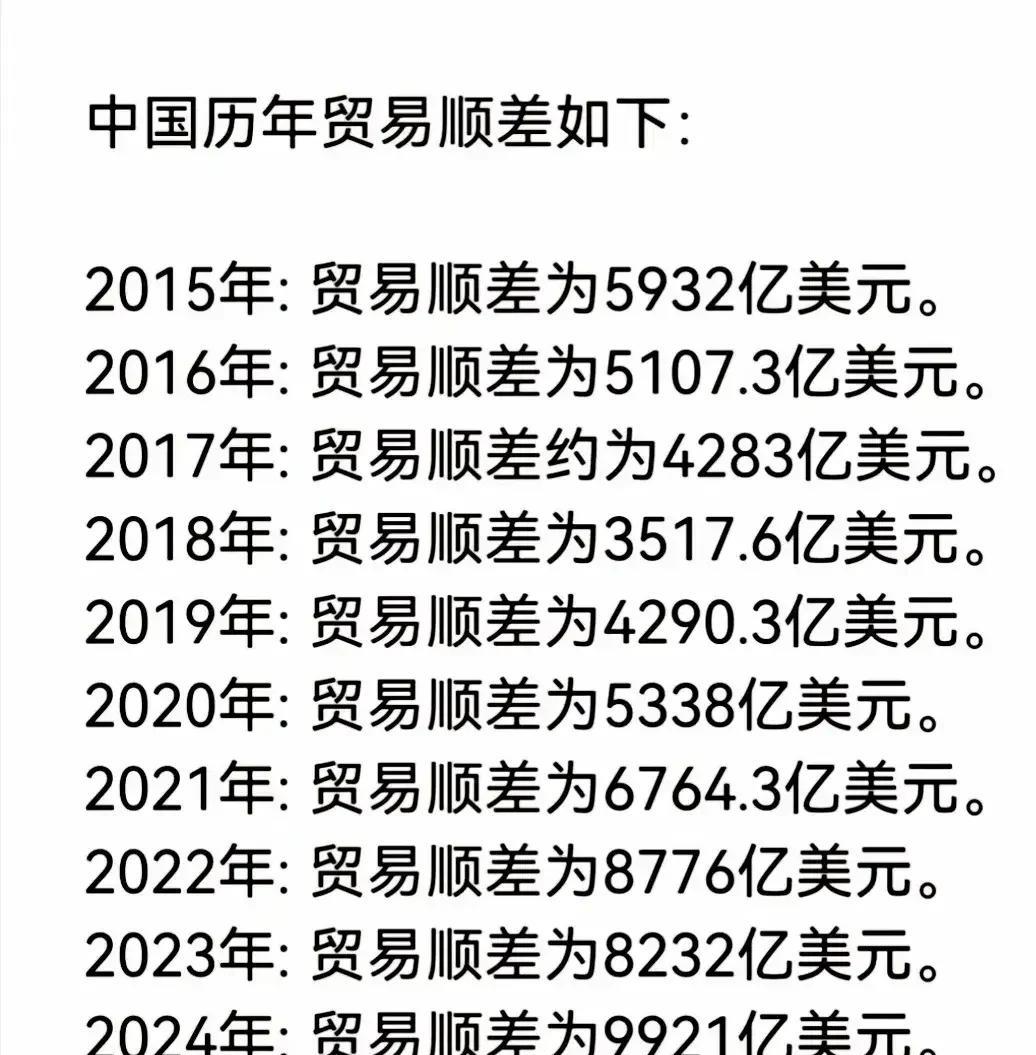 从出口数据来看,美国对华贸易战不是打了一个“寂寞”,而是把中美打成了相互依存度更高的G2。 如果你看了2015年到2024年的中国出口数据,你不得不开始怀疑特朗普发起的贸易战真实目的究竟是什么。 2015年-2018年,也就是说在特朗普发起对华贸易战之前,中国的贸易顺差是逐年下降的。 但贸易战开打至2024年,中国的贸易顺差居然增长了两倍,2024年顺差更是无限接近1万亿美元,2025年破万亿美元是大概率的事情。 这,可能还不是最重要的。 贸易战真正的“含金量”还是中美商品对彼此出口的结构性变化。 印象中,美国对华出口的主要商品是科技含量十足的高端制造业商品,但真实的情况可能会颠覆你的想象。 以2024年为例,中国对美出口最大的商品居然是电机,电气等科技含量十足的商品。 而美国对华出口最大的商品居然是矿物燃料,粮食等。 有人说,特朗普的对华贸易战打了一个寂寞,但我觉得还是有失偏颇。 真正的结果就是贸易战硬生生把中美打成了真正意义上的“G2”。 或许,美国依旧心怀侥幸,但距离接受中国的实力地位与它自己已经平起平坐的现实已经不远了。 一旦美国真正从心理上接受了中国实力已然追平了它的时候,中美事实上已经在经济上形成了G2。这种事实上的G2 并不是美国设想的以美国为主导,中国从属的G2,而是基于实力出发的平起平坐。 当然,要让美国真正从内心里完全接受中国已经崛起的事实,极有可能还是需要一场军事较量。