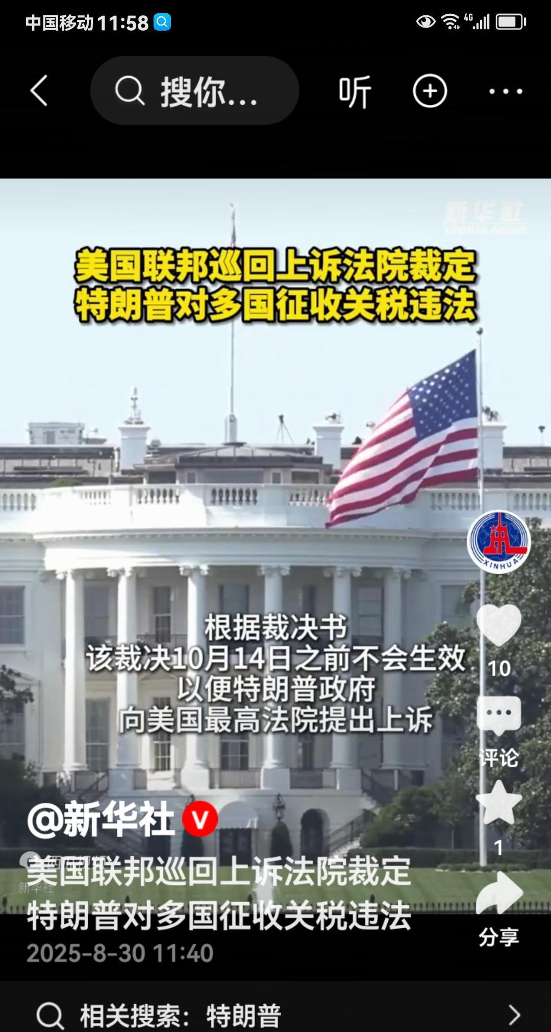 迎头一闷棍,美国巡回上诉法院,裁定特朗普对多国加征关税违法。 弄半天,川普搞得全世界鸡犬不宁的收税法案,原来连国内法律都不承认。 [信息来源:新华社。2025,8,30]