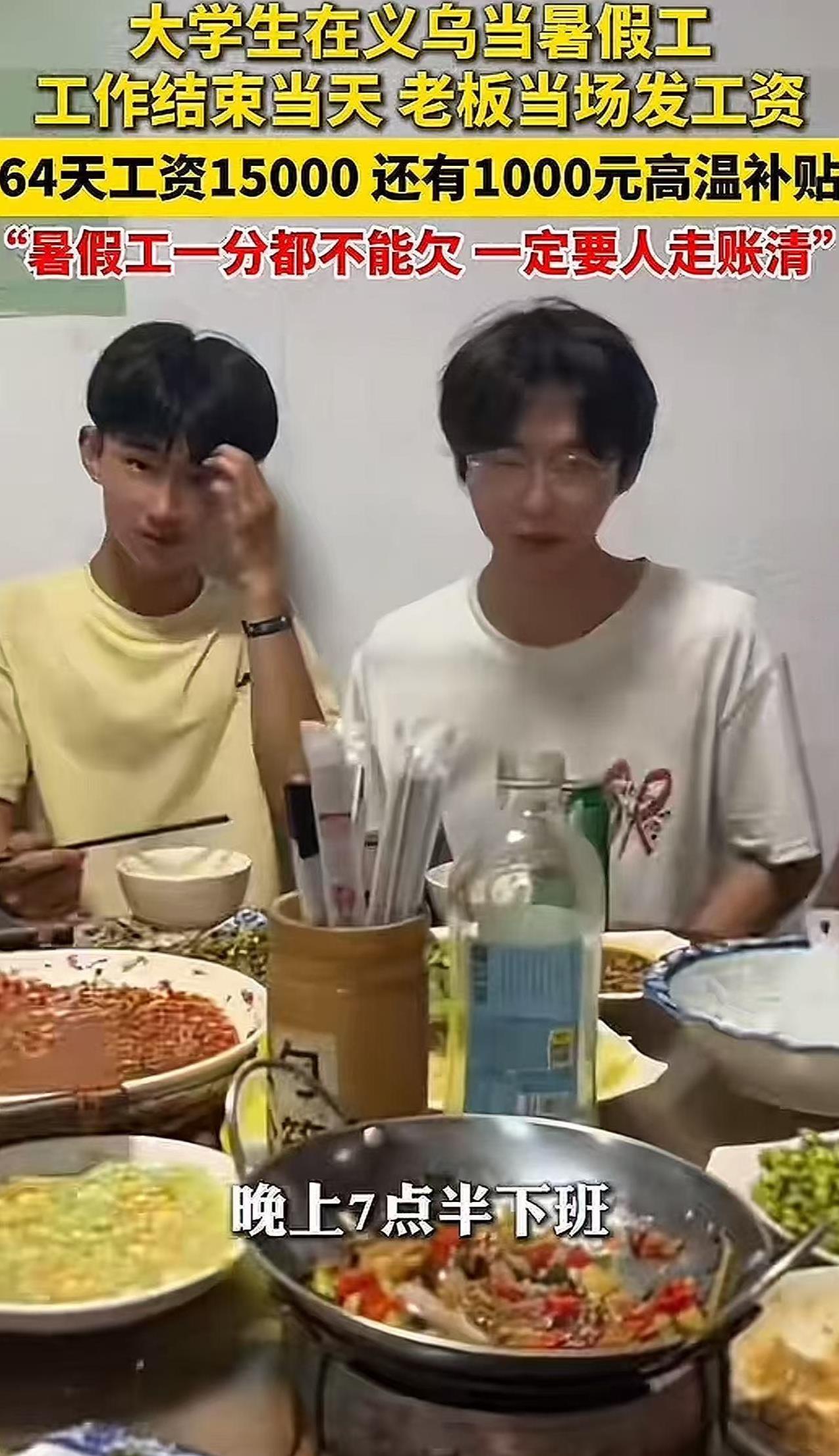 “这老板必须让他火!”浙江义乌,2个大学生暑假去义乌打工,64天工资算起来,每人有15000元。可是发工资的时候,老板却给他们一人5000的现金!大学生愣了一下,难道老板想克扣工资?可接下来老板的做法让他们泪目! (来源:美丽浙江) 虽然是最后一天上班了,两个大学生还是坚持从早上干到晚上,把店里的活给老板干好。 想到即将能拿到两个月15000 元的工资,两位大学生的内心就像燃起了一团炽热的火焰。 他们计划着,要用这笔钱给日夜操劳的父母挑选一些贴心的礼物,再为自己交上新学期的学费,以此减轻父母肩头沉重的负担。 就在他们满心期待的时候,老板手里拿着一叠厚厚的钱走了过来。 “这段时间,你们真的辛苦了,现在给你们发工资,一人 5000 现金……” 这话一出,两位大学生瞬间愣住了,他们心里迅速算起账来,自己一共干了64天,明明算好的是 15000 元工资,怎么到手的现金只有 5000 元呢? 他们下意识地皱起眉头,心中涌起一丝担忧,以为老板要克扣他们的辛苦钱。 然而,老板接下来的话却让他们大吃一惊。老板接着说道:“店里现金只有这么多了,不过你们放心,手机上我再给你们每人转 1 万,另外考虑到最近天气炎热,工作辛苦,还有 1000 块钱的高温补贴……” 话音刚落,老板便毫不犹豫地拿出手机,动作麻利地给两个大学生一人转了 11000 元! 看到手机里到账的金额一分不少,反而还多了 1000 块钱,两位大学生的眼眶瞬间湿润了,激动得一时说不出话来。 过了好一会儿,他们才声音哽咽、由衷地对老板说道:“祝叔叔生意越做越大,红红火火!” 老板听了这话,脸上笑开了花,开心地说道:“冲你这句话,我再给加 100 块钱!” 说完,老板还热情地邀请两位大学生一起去吃了一顿丰盛的晚餐。 事后,袁老板感慨地说:“他们真的特别优秀,一天假都没请过,每天都是早上 8 点准时到店里,晚上 7 点半才下班。他们虽然是暑假工,但这份辛苦钱一分都不能欠,一定要人走账清,答应给人家多少就应该给人家多少,这是做人的基本诚信!” 袁老板,无疑是一位讲诚信、高素质、拥有大格局且暖人心扉的老板。 他用实际行动诠释了诚信经营的真谛,以温暖和善意对待每一位员工。 他的这份美好品质,不仅赢得了员工的敬重与感激,更为社会树立了榜样,值得我们每一个人学习与赞美! 也真心希望所有的打工者都能被社会温柔以待,每一份付出的劳动都能收获应有的报酬!