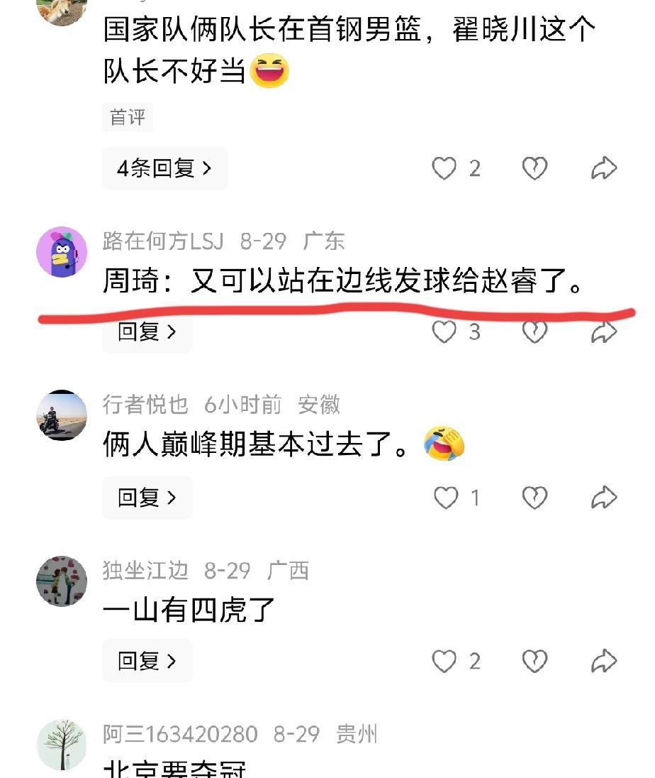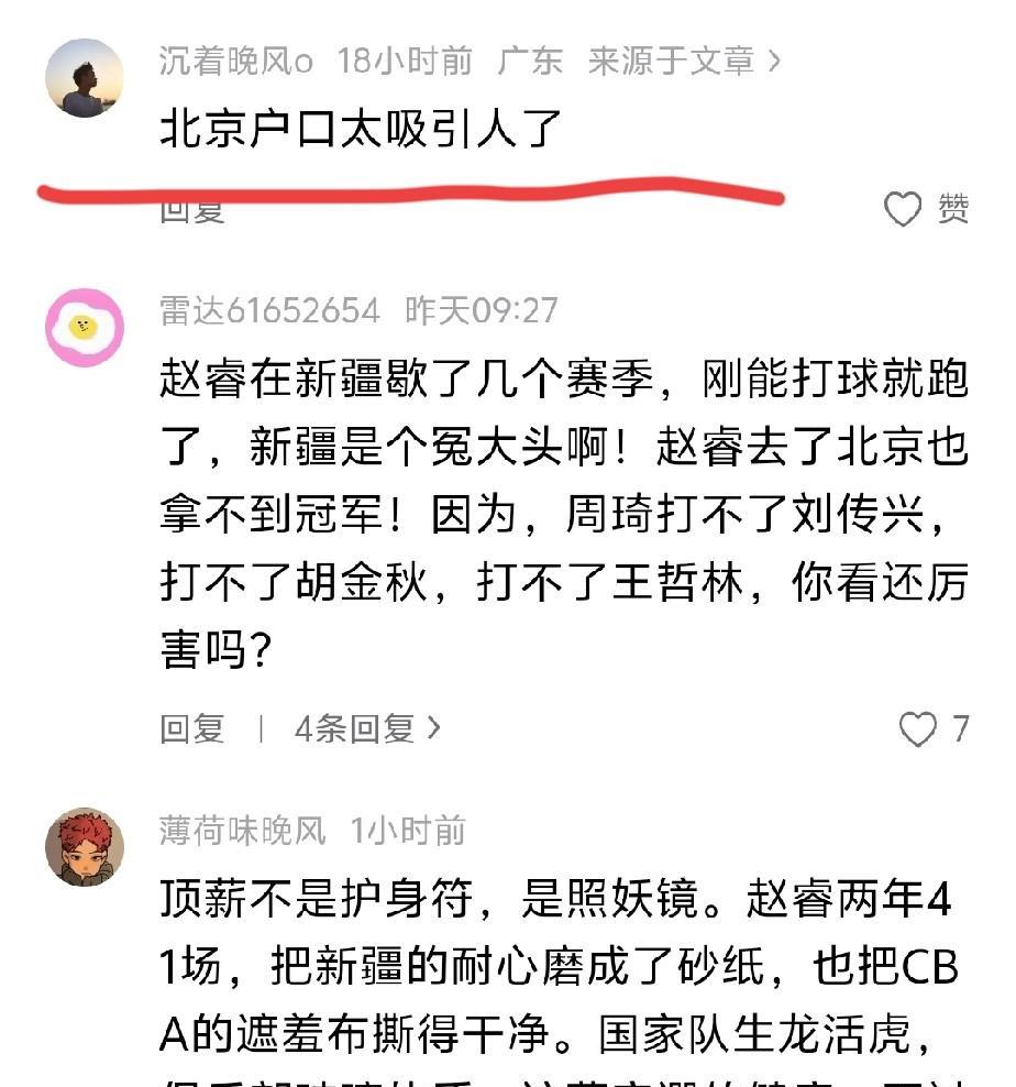 广东球迷酸了,先周琦,再赵睿,加盟北汽不是送上祝福,而是各种讽刺,格局不是一般的小,精彩评论如下: 1.“边线球”组合北汽再聚首,这句话可以说一辈子,永远不翻篇。 2.两个老病号又搞一起了,玻璃人属性摘不掉了,但伤病也是比赛的一部分。 3.北京户口真吸引人,好像广东户口也不差吧,因这点加盟就格局太小了。 4.国企就是有钱,直接发冠军给北汽吧,这句是真酸呀,广东宏远加油吧! 5.恭喜新疆队解套,那新疆球迷应该恭喜广东队解套了,这是一个循环。