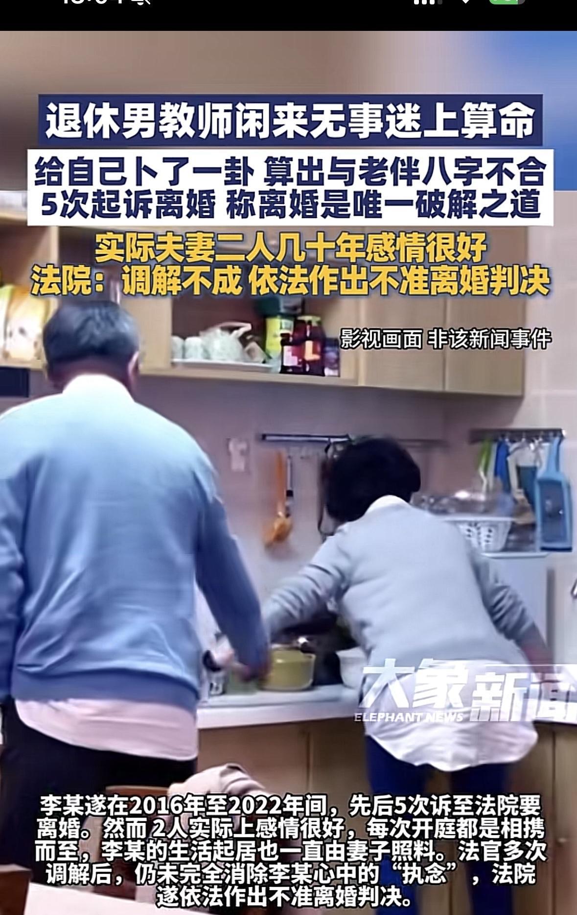 “笑不活了!”河南新乡,男子退休后太无聊,就开始每天捧着本易经研究,某天他给自己算了一卦,发现他和相伴几十年的妻子竟八字不合、五行生克,男子怕影响运势,给自己招来灾祸,觉得只有离婚才能化解,于是,他先后5次起诉离婚,然而,法官却发现一件怪事… 8月28号,据金羊网报道,李某退休之后,一下子从忙碌的教学工作中闲了下来。 这人一闲,就想找点事儿做。 李某不知怎么的,突然就对易经产生了浓厚的兴趣,整天捧着易经的书研究,后来还开始给人算起命来。 一开始,也就是给亲戚朋友随便看看,大家也没当回事儿,就当是退休后的一个消遣。 可这算着算着,李某就入了迷。 有一天,他给自己算了一卦,这一卦可把他算得心神不宁。 卦象显示,他和相伴了几十年的发妻八字不合、命理相克。在李某的认知里,这命理相克可不是小事儿,会影响自己的运势,甚至可能带来灾祸。 他越想越害怕,觉得只有离婚才是唯一的破解之道。 从2016年开始,李某就像着了魔一样,先后5次跑到法院去起诉离婚。 这5次起诉,可把法院的工作人员折腾得够呛。 可每次开庭的时候,李某都和他的妻子总是手牵手、肩并肩地走进法庭。两人看起来感情特别好,一点儿都不像是要闹离婚的样子。 其实,李某和他的妻子结婚这么多年,感情一直都很深厚。李某虽然退休了,但生活起居一直都被妻子照顾得无微不至。 每天早上,妻子会早早地起床给他做好营养丰富的早餐,晚上睡觉前,妻子会帮他准备好热水泡脚。 家里的大事小事,妻子也都安排得妥妥当当,让李某根本不用操心。 法官在审理这个案子的时候,也觉得特别纳闷。明明两人感情这么好,为什么李某非要离婚呢? 经过多次和李某沟通,法官才了解到事情的缘由。法官知道,这问题出在李某对算命的痴迷上,是他的“执念”在作祟。 于是,法官开始了耐心细致的调解工作。每次开庭之后,法官都会把李某留下来,跟他谈心。 法官苦口婆心地说,这易经算命也就是一种传统文化,不能完全当真。你和妻子这么多年风风雨雨都走过来了,感情这么深厚,怎么能因为一个算命的结果就轻易放弃呢? 可李某当时就像钻进了牛角尖,怎么都听不进去,还是坚持要离婚。 有人说,过去有句古话,说不在房子不在坟,就在没福的人,这说明了什么?迷信无用,纯属自己坑自已! 这李某应了一句话:天下本无忧,庸人自扰之。 那么,从法律角度,怎么看待李某的行为? 《民法典》第1079条规定:夫妻一方要求离婚的,可以由有关组织进行调解或者直接向人民法院提起离婚诉讼。人民法院审理离婚案件,应当进行调解;如果感情确已破裂,调解无效的,应当准予离婚。 有下列情形之一,调解无效的,应当准予离婚:重婚或者与他人同居;实施家庭暴力或者虐待、遗弃家庭成员;有赌博等恶习屡教不改;因感情不和分居满二年;其他导致夫妻感情破裂的情形。 李某虽5次起诉离婚,但法院经过审理,认为两人感情并未破裂,依法作出了不准离婚的判决。 核心原因在于他的诉求不符合法定离婚条件。 首先,两人没有实质感情破裂的证据。李某与妻子每次开庭均“相携而至”,且妻子长期照料其生活起居,表明双方感情基础稳固,无《民法典》列明的“感情确已破裂”情形。 李某因算命结果主张离婚,属于主观臆断的“命理相克”,而非客观存在的感情破裂事实,法院依法不予支持。 法院在审理中多次组织调解,符合《民法典》“应当进行调解”的程序要求。 调解过程中,法官通过释法明理,揭示算命结果的非理性,促使李某反思自身行为,最终实现“调解无效但感情未破裂”的司法认定。 《民法典》第8条规定:民事主体从事民事活动,不得违反法律,不得违背公序良俗。 李某因算命结果主张离婚,涉及以下违背公序良俗的情形: 算命属于封建迷信,缺乏科学依据。李某将个人命运与婚姻关系完全寄托于虚幻的命理,忽视夫妻共同生活的现实基础,违背了理性对待婚姻的善良风俗; 婚姻以感情为基础,李某因迷信动摇婚姻关系,可能引发家庭矛盾,损害配偶权益,违背社会倡导的家庭责任与忠诚义务。 法院通过判决不准离婚,明确司法不认可将封建迷信作为解除婚姻关系的合法依据。 民事行为需以现实为基础,迷信等非理性因素不得成为法律行为的有效动因。 判决作出后,法官并没有就此放手,他知道李某心里的“结”还没解开,于是又多次到李某家里,跟他做思想工作。 慢慢的,李某的心态开始发生了变化。他意识到,自己差点因为一个虚幻的算命结果,就失去了最珍贵的感情。 终于,在法官的多次劝解下,李某幡然醒悟。 对此,你怎么看? 关注@运良说法 学法律知识不迷路 #头号创作者激励计划#