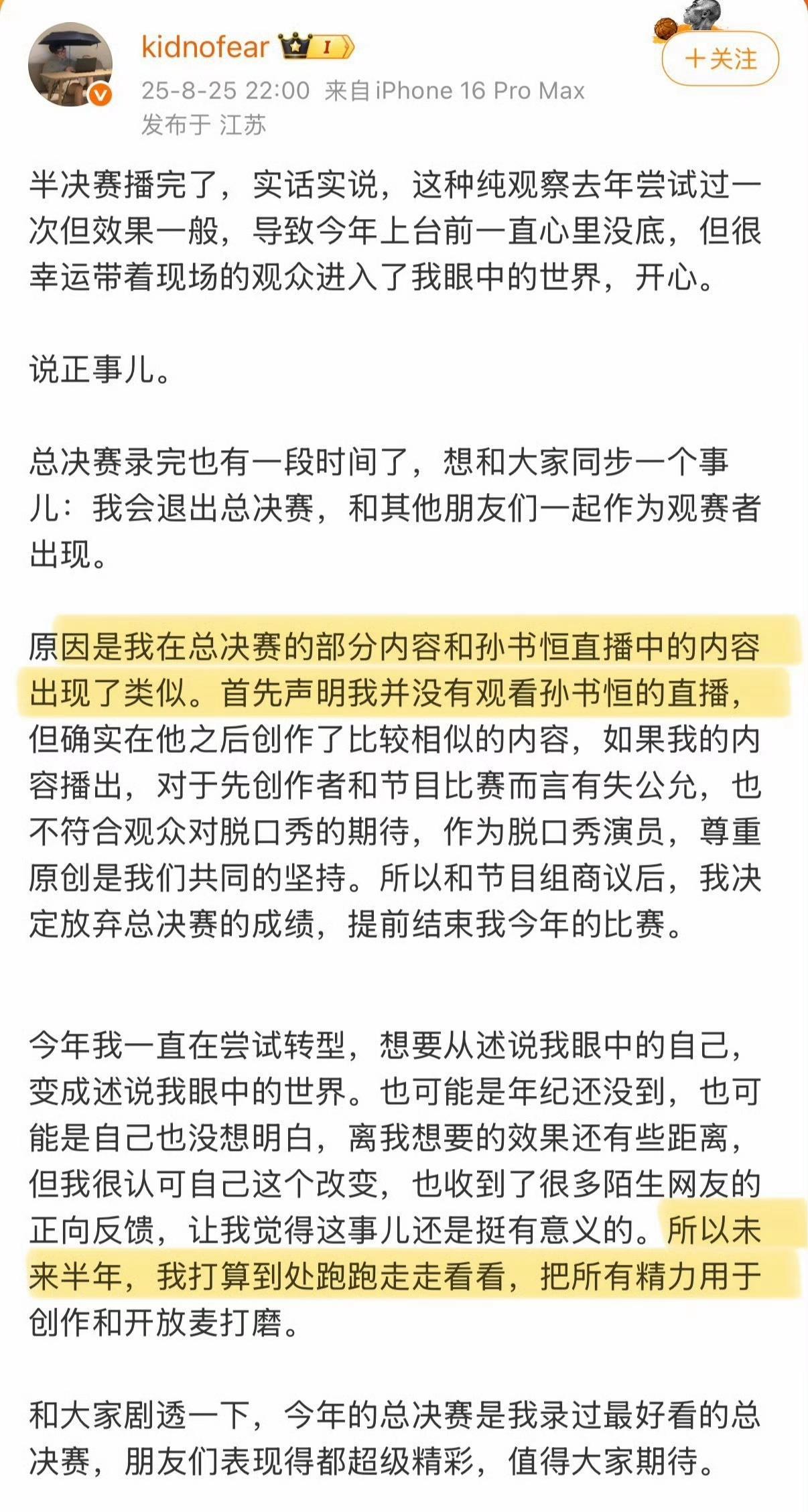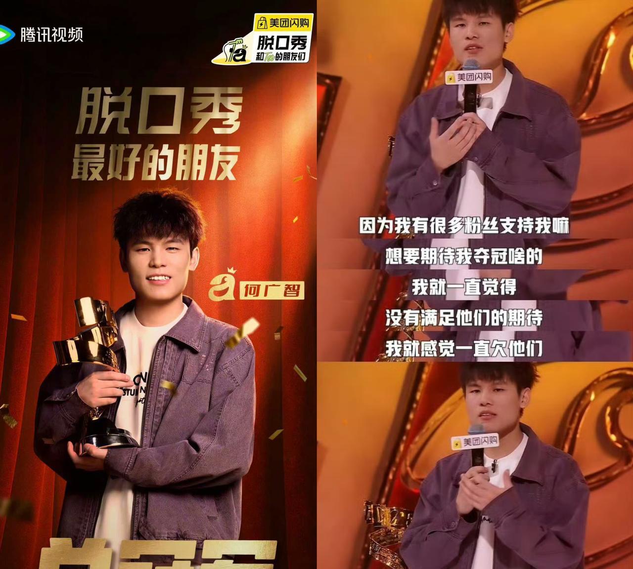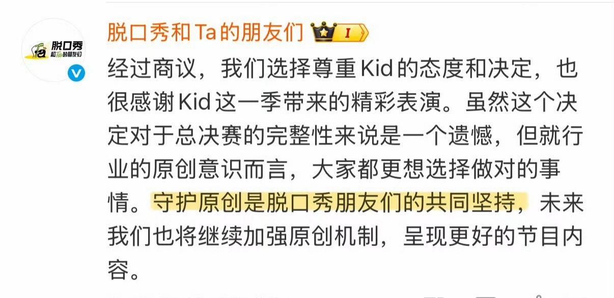 看《脱口秀和ta的朋友们》第二季总决赛的第一个好奇点不是谁是冠军,而是如何处理“Kid退赛”。 本以为节目组会把Kid的画面剪的一干二净。却发现,除了没让他上台,Kid无处不在。 冠军奖杯台上kid的名牌清晰可见,镜头还不止一次扫过坐在选手席的Kid(图1)... 想想也是。Kid不是被封sha了,不合适剪掉他的所有镜头。 在Kid发表退赛声明后,节目组也官方回应尊重他的选择,并强调守护行业原创的重要性。(图2图3) 不过,节目组要是能在总决赛的视频中通过字幕或其他方式提醒观众“Kid已退赛”,会对不明真相的观众更友好。 最后,看到何广智夺冠太开心了!七年了,终于等到这一天!他值得!(图4) 就像呼兰在后采时流着泪激动的说,这个夏天最迷人的地方,是何广智夺冠!(图5) 事件回顾:脱口秀演员Kid在《脱口秀和ta的朋友们》第二季总决赛的段子被质疑抄袭孙书恒早前直播中的内容。事件发酵后,Kid宣布退出比赛。当时,总决赛已完成录制。