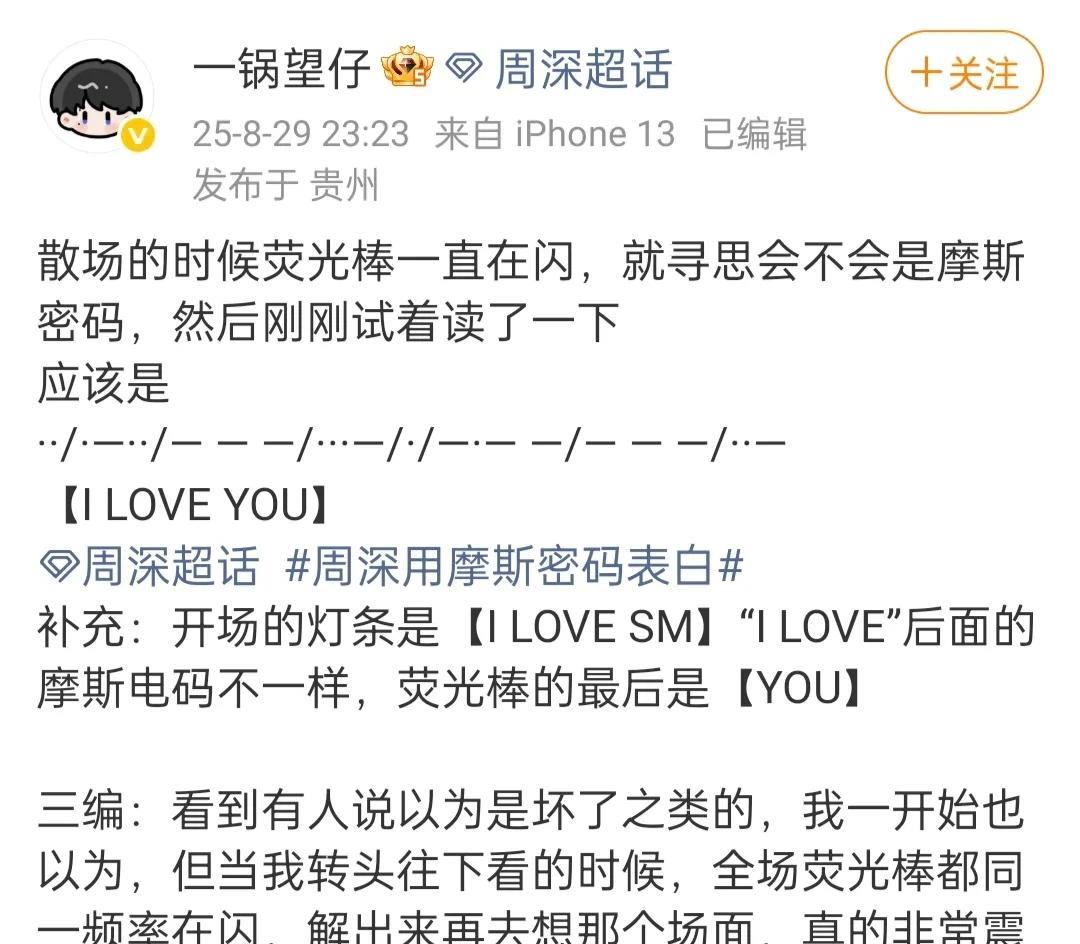 周深用摩斯密码表白粉丝! 原来真的是摩斯密码,周深真的是细节控!太浪漫了! 开场的灯条是【I LOVE SM】散场是“I LOVE”荧光棒的最后是【YOU】 这就是霸道总裁的表达方式吗?[呲牙] 七夕场的演唱会真的好浪漫! 这样盛大又璀璨的梦!今晚还有一场! #周深#