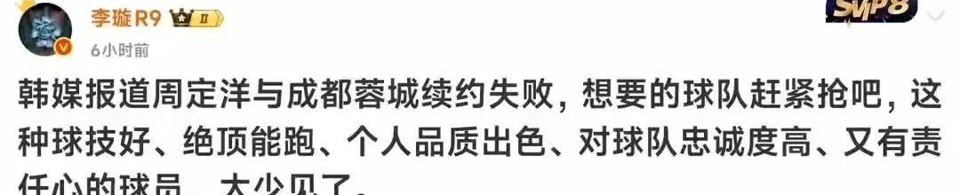 蓉城得罪人了?足媒,比国足的底限还低! 周末,蓉城与上港之战,是夺冠关键战,没想到一时间,部分媒体大佬,纷纷跳出来作妖! 矛头都是针对蓉城的, 什么主教练失利将会被解约,什么队长周定洋续约失败,什么玉昆要收购罗慕洛、周定洋、徐正源。。。 本来大战前两方都会有备战消息传出,但现在一方风平浪静,另一方被炒上了天。 大概谁受益,谁就是幕后黑手,这个道理懂得都懂。 现在连胡荷韬被增招入u22,都充满了阴谋! 蓉城虽有最火的球市,却不善公关。 本人虽不是蓉城球迷,也真的看不惯,奉劝某些球队要善良,去凭实力拿下蓉城。 也奉劝某些媒体大佬,别为了点钱,骂完天津,搞蓉城,还有脸吗?别丢了道德底限。 凭这些手段了,拿了冠军,也是让人不齿?