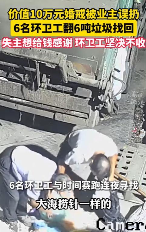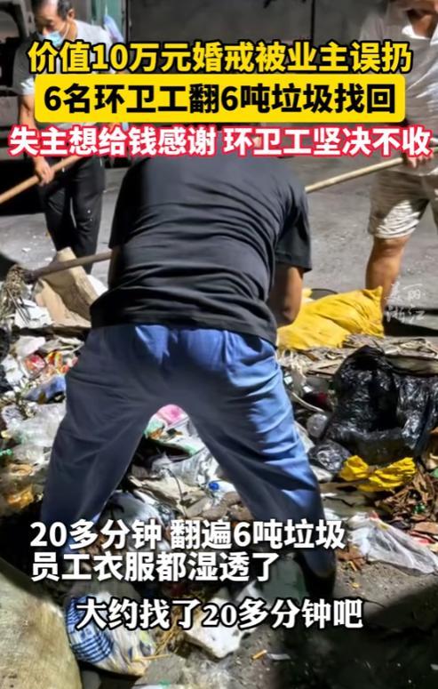 8月28日,浙江慈溪,一女子不小心将10万元的婚戒扔了!女子直言:10克拉的,这可是结婚的戒指!而幸运的是,6名环卫工人连夜翻找6吨垃圾,终于失而复得!但网友炸锅了!网友:必须拿钱感谢! 这位女士后来回忆,那天家里收拾东西,她随手把一些废品装袋扔了,可转头就想起,婚戒之前随手放在那些东西里,没来得及拿出来! 当她发现戒指丢了,她赶紧跑到扔垃圾的地方,可垃圾早就被运走了,当时她心都凉了半截,嘴里不停念叨:“这可是结婚的戒指啊,10克拉的,咋就这么不小心给扔了!” 没办法,她只能赶紧联系当地的环卫部门求助,环卫工人们听说这事儿,都挺理解她的心情,毕竟结婚戒指对一个人来说太重要了,当天晚上,6名环卫工人没顾上休息,直接赶到了垃圾处理点。 要知道,垃圾点里的垃圾足足有6吨重,而且又脏又乱,想从这么多垃圾里找出一枚小小的戒指,难度可想而知,可这些环卫工人没抱怨,几个人分工合作,拿着工具一点点翻找,生怕漏掉任何一个角落。 夜里温度不高,他们额头却冒出了汗,手上也沾满了污渍,就这么坚持着找了大半夜,功夫不负有心人,天快亮的时候,有位环卫工终于在一堆废品里,看到了那枚闪着光的钻戒,赶紧小心地捡了出来。 第一时间联系了失主,当女士拿到婚戒时,激动得话都说不连贯了,当即就拿出钱想要感谢这6位环卫工人,可让人没想到的是,环卫工人们连连摆手拒绝,说这是他们应该做的,坚决不肯收钱。 环卫工人不仅辛苦,还特别有职业道德,这样的好人就该被称赞。 信息来源:《6名环卫工翻6吨垃圾找回价值10万元婚戒失主想给钱,环卫工坚决不收,第二天送来锦旗感谢。》美丽浙江