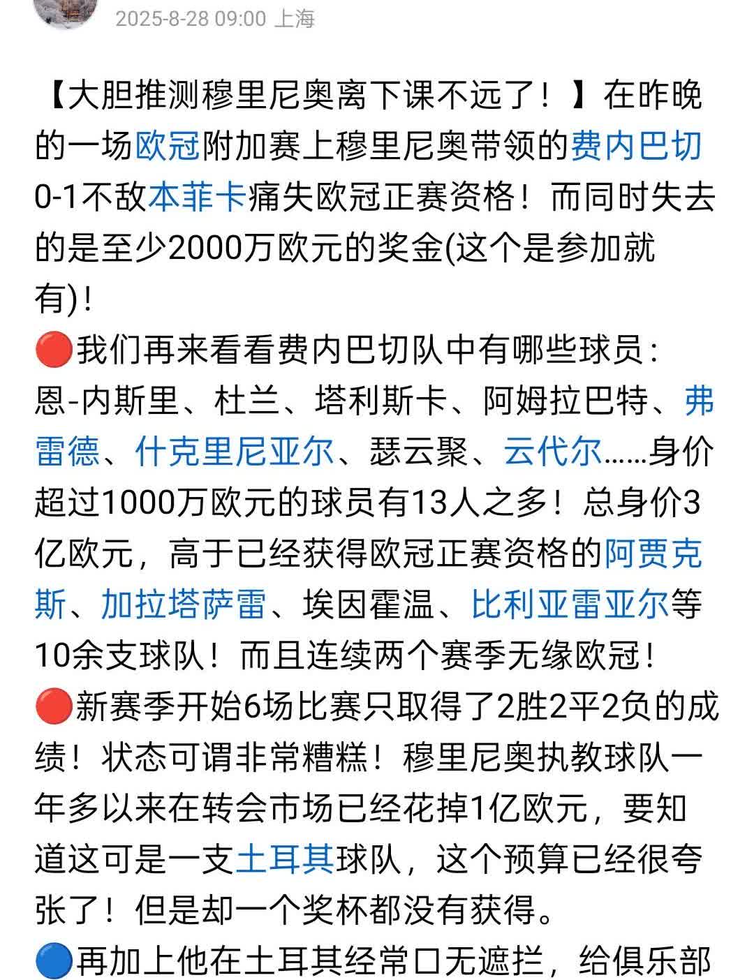 【莫大的耻辱!穆里尼奥下课后费内巴切股票暴涨7%】今天费内巴切官宣主帅穆里尼奥下课,而在这一消息公布后俱乐部股票竟然大涨!这对于曾经贵为世界名帅的穆里尼奥来说简直就是耻辱! 🔴不过他的下课并不让我意外,因为就在一天前我已经预测到他离下课不远了!穆里尼奥已经江郎才尽,休息一段时间试试带国家队吧,俱乐部已经不适合他了!