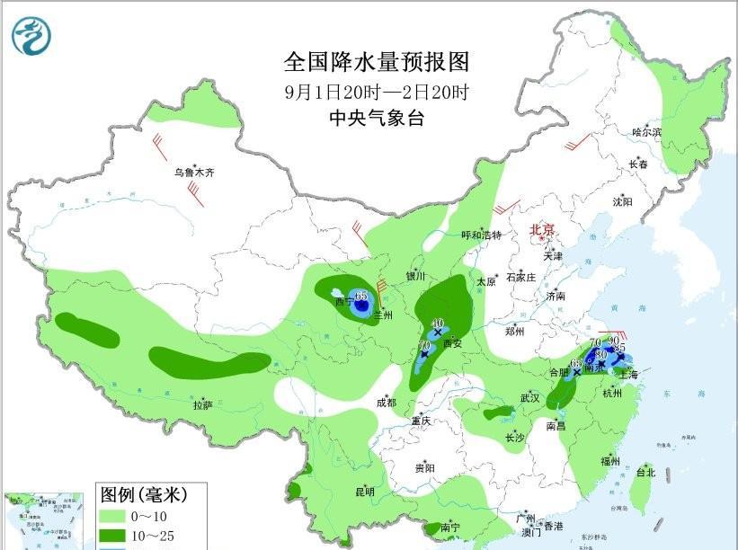 8月30日夜间至9月1日,东北地区东部和北部、黄淮、江淮、江汉、江南北部等地有小