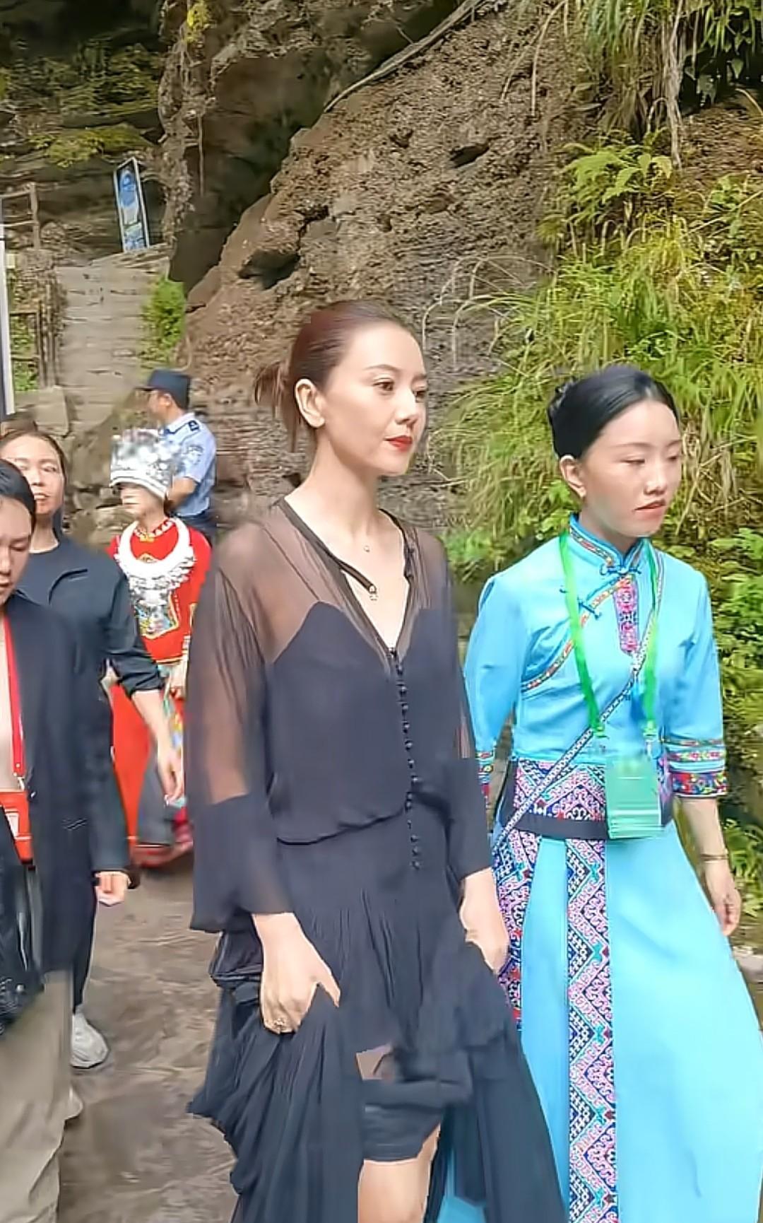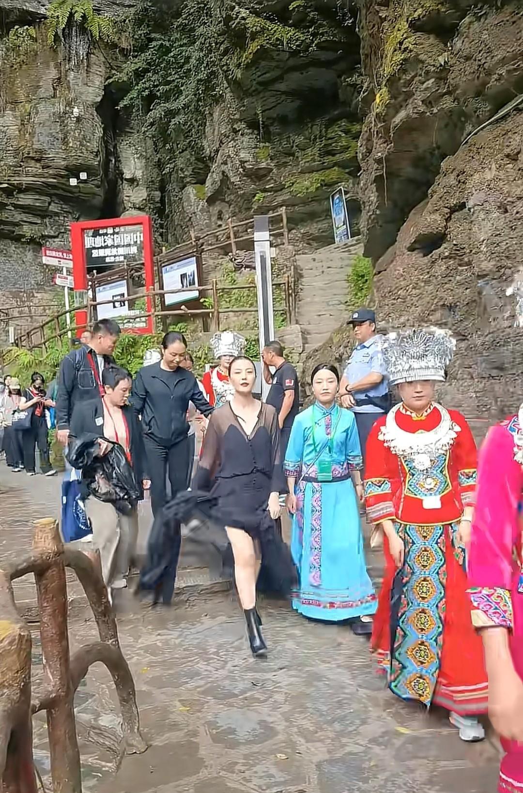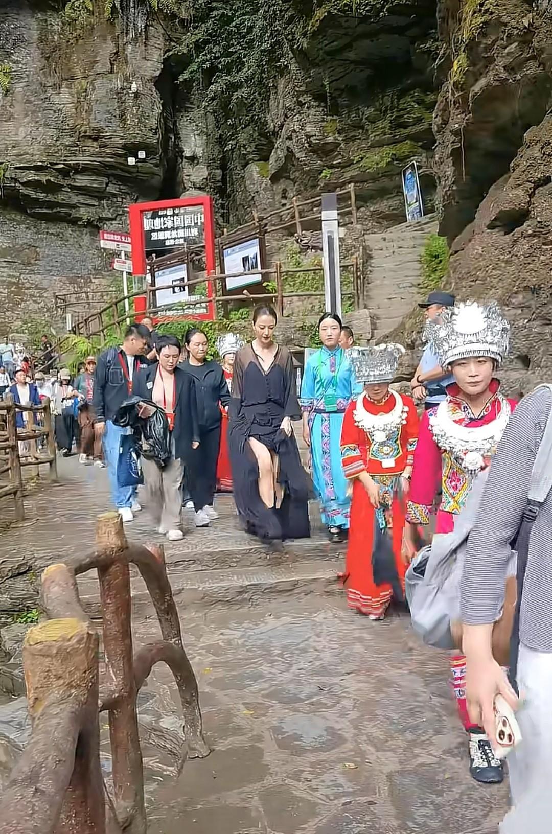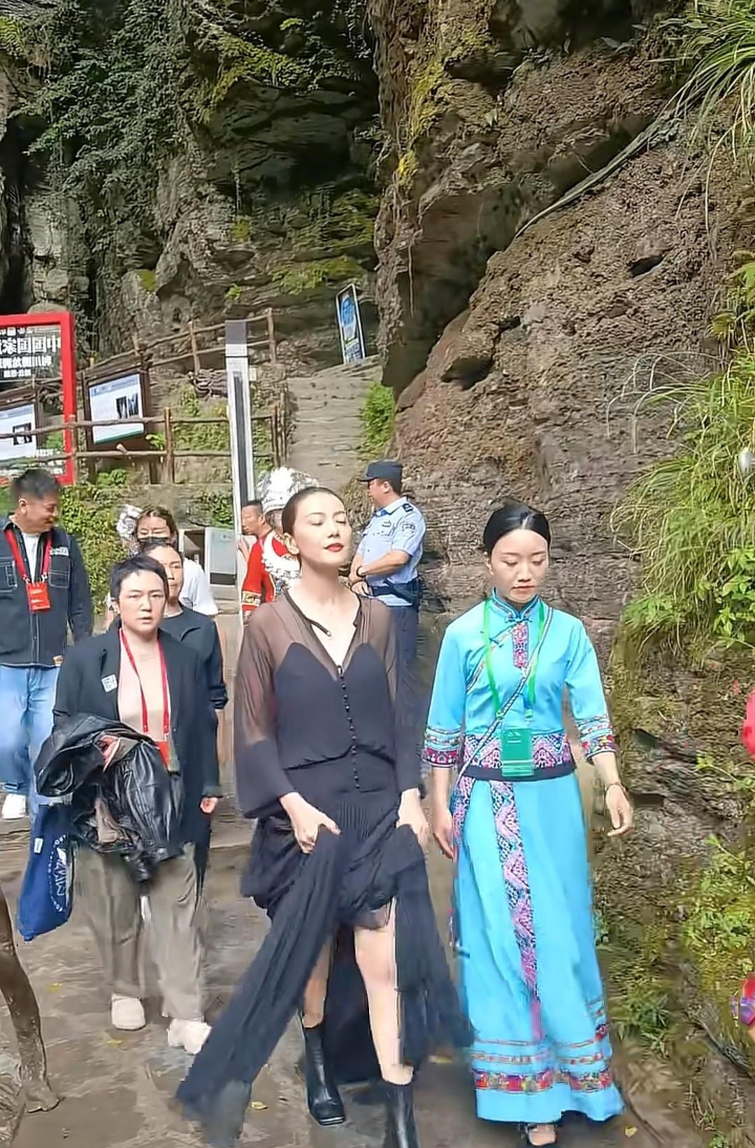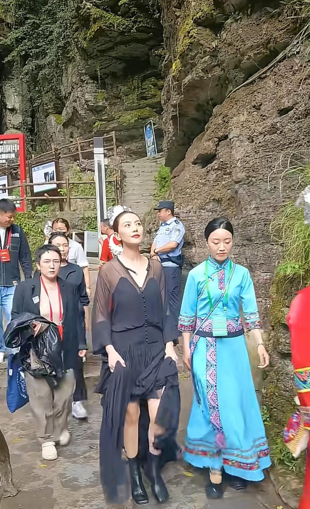 高圆圆现身恩施腾龙洞,当天穿了一件长款黑色拖地连衣裙,短筒高跟鞋。这身俗气的着装