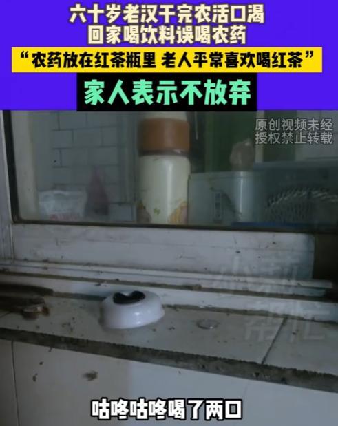 “这下真的后悔了!”8月28日,河南洛阳,一名60岁的大爷在地里干完农活后,因为太渴,随手喝了桌子上的饮料,不料却进了ICU!原来,饮料瓶里被老伴装了农药,她直呼:真的后悔死了!网友:心是真的大! 大爷跟往常一样,去地里干农活,这庄稼人干活向来卖力,一忙就是大半天,太阳晒得人浑身是汗,嗓子干得像要冒烟,好不容易忙完,大爷拖着累得发麻的腿回了家,一进门就渴得不行。 他眼瞅着窗台上放着一瓶饮料,看着像是自己常喝的红茶,也没多想,拿起来就拧开盖子,“咕咚咕咚”喝了大半瓶,可没一会儿,大爷就觉得不对劲了,先是肚子里一阵翻江倒海的疼。 接着头晕得厉害,浑身没力气,还一个劲地恶心呕吐,家里人一看这情况,吓坏了,赶紧找车把他往医院送,到了医院,医生一问情况,再看大爷的症状,初步判断是中毒了,赶紧安排检查。 这一查可不得了,医生说大爷是农药中毒,情况危急,得立刻进ICU抢救,后来老伴才哭着说出了实情,原来之前她用空的红茶饮料瓶装了农药,想着暂时放窗台上,回头再处理。 因为大爷平时就爱喝红茶,那瓶子颜色和红茶也像,她当时没太当回事,忘了跟家里人说,也没做个明显标记,没想到大爷干活回来口渴,误把这装着农药的饮料给喝了。 现在大爷在ICU里已经待了一段时间,光治疗费就花了10多万,老伴天天在医院门口抹眼泪,嘴里不停念叨着“真的后悔死了”,要是当时多留个心眼,就不会出这种事了。 这事传到网上,不少人说“心是真的大”,农药这么危险的东西,怎么能随便用饮料瓶装,还放在容易拿错的地方,这些危险品,一定要好好存放,可别图省事埋下隐患,不然真出了事,后悔都来不及啊! 信息来源:《六十岁老汉干完农活口渴回家喝饮料误喝农药,“农药放在红茶瓶里,老人平常喜欢喝红茶”,家人表示不放弃。》民生频道