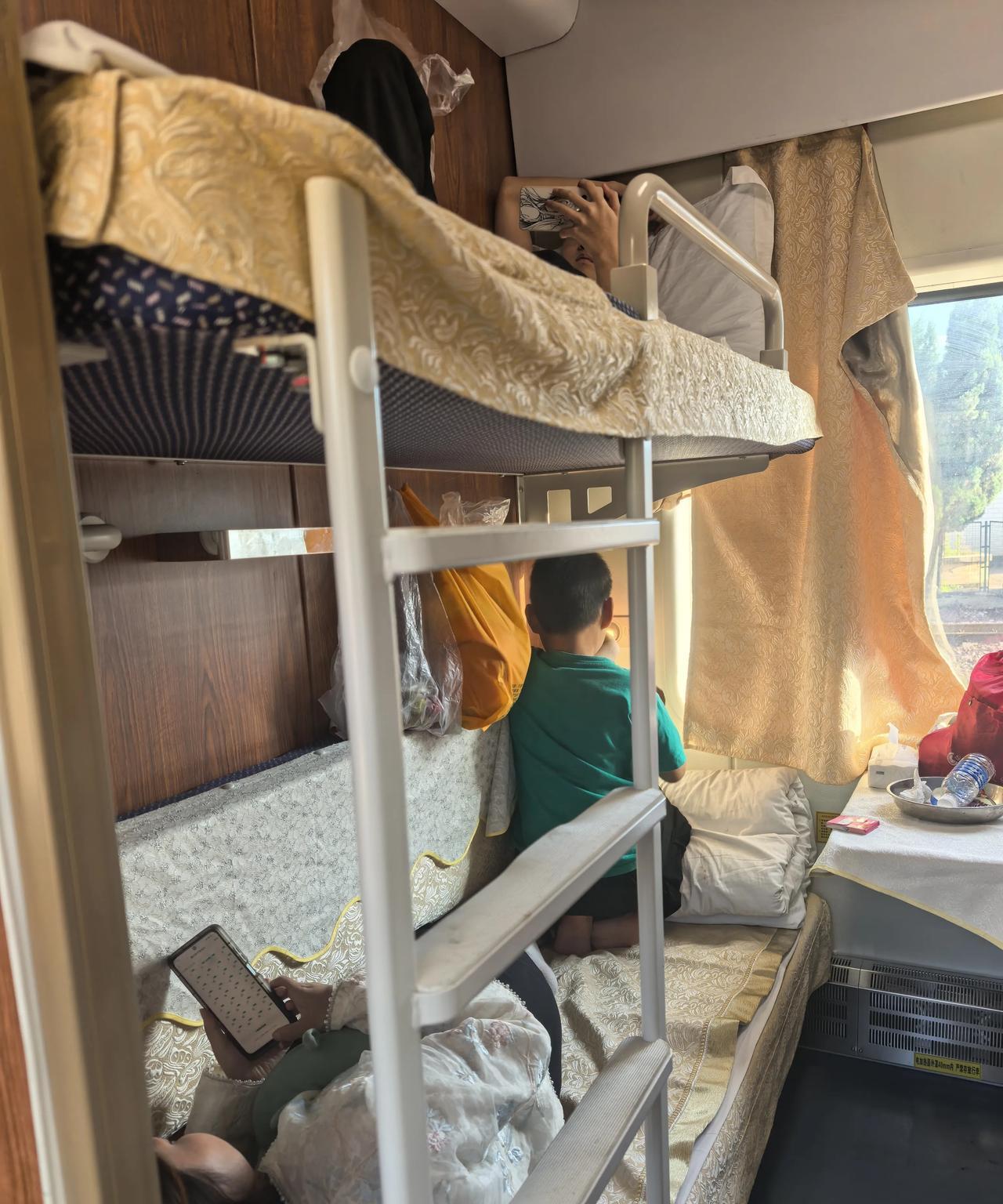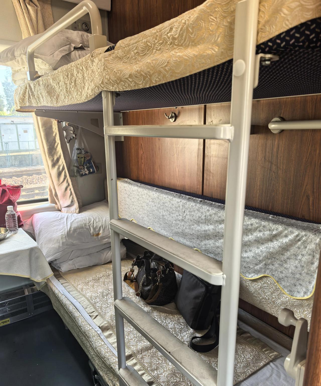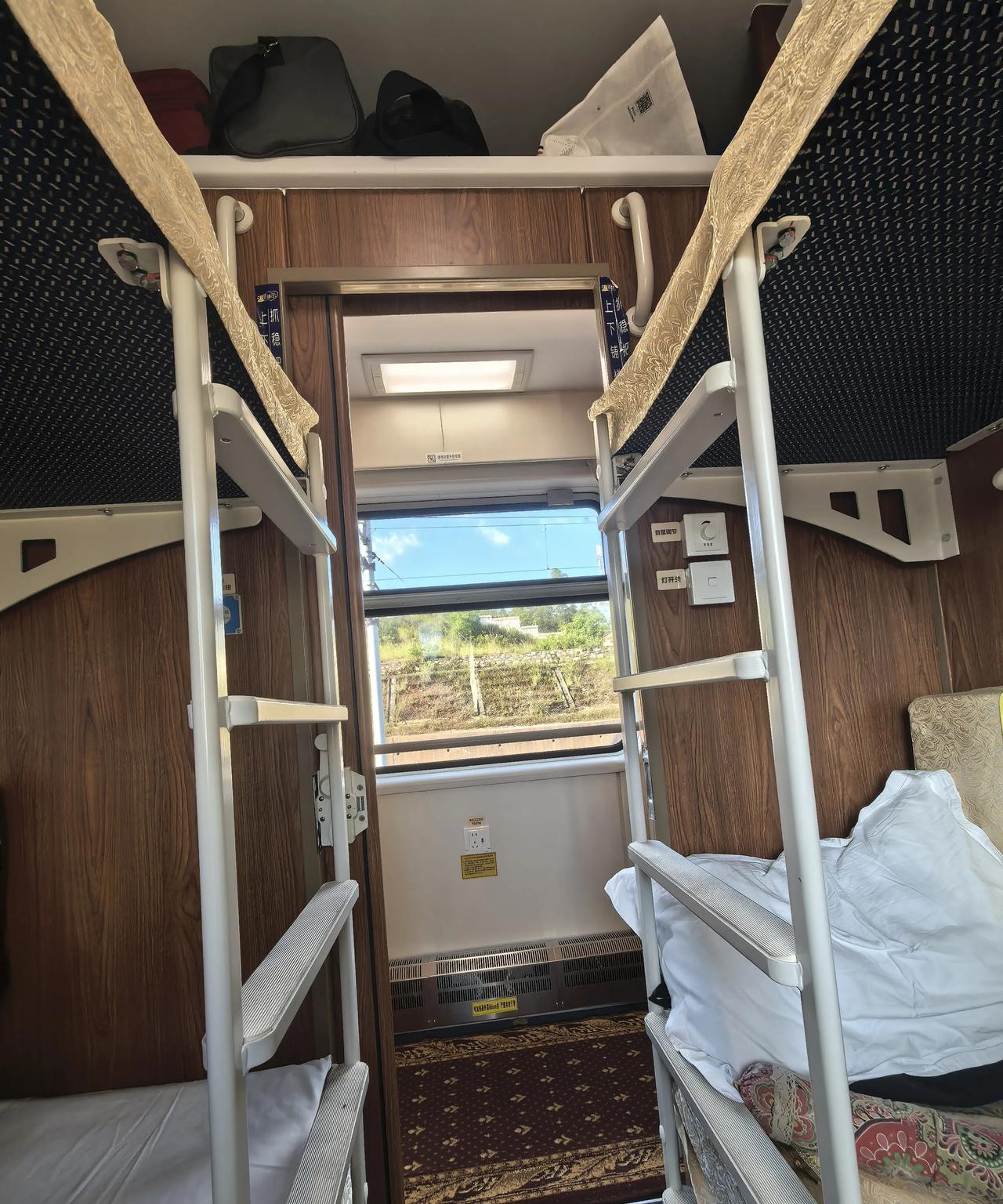 好久没坐老火车的软卧了,这次从昆明去成都买了个软卧票,可这个软卧的设计有点不很理想。 一开包厢门,左右两边各是一个挺宽的梯子,把车厢搞得很狭窄,而下铺又装了一个厚厚的大靠背,把原本挺宽的铺位也弄得窄巴了。以前坐过两回软卧,那两个车型给上铺乘客上下用的设施是靠边上的折叠式脚蹬,不占地方,也没整大靠背,感觉宽敞。 不过,这个软卧车厢的充电插座很多,每个铺位都有两个插孔,过道也有,不像硬卧车厢一般只有三个,需要排队。