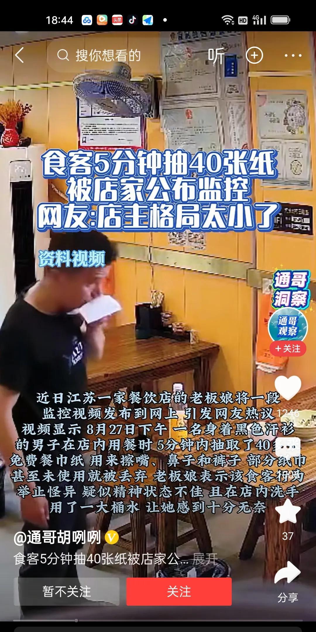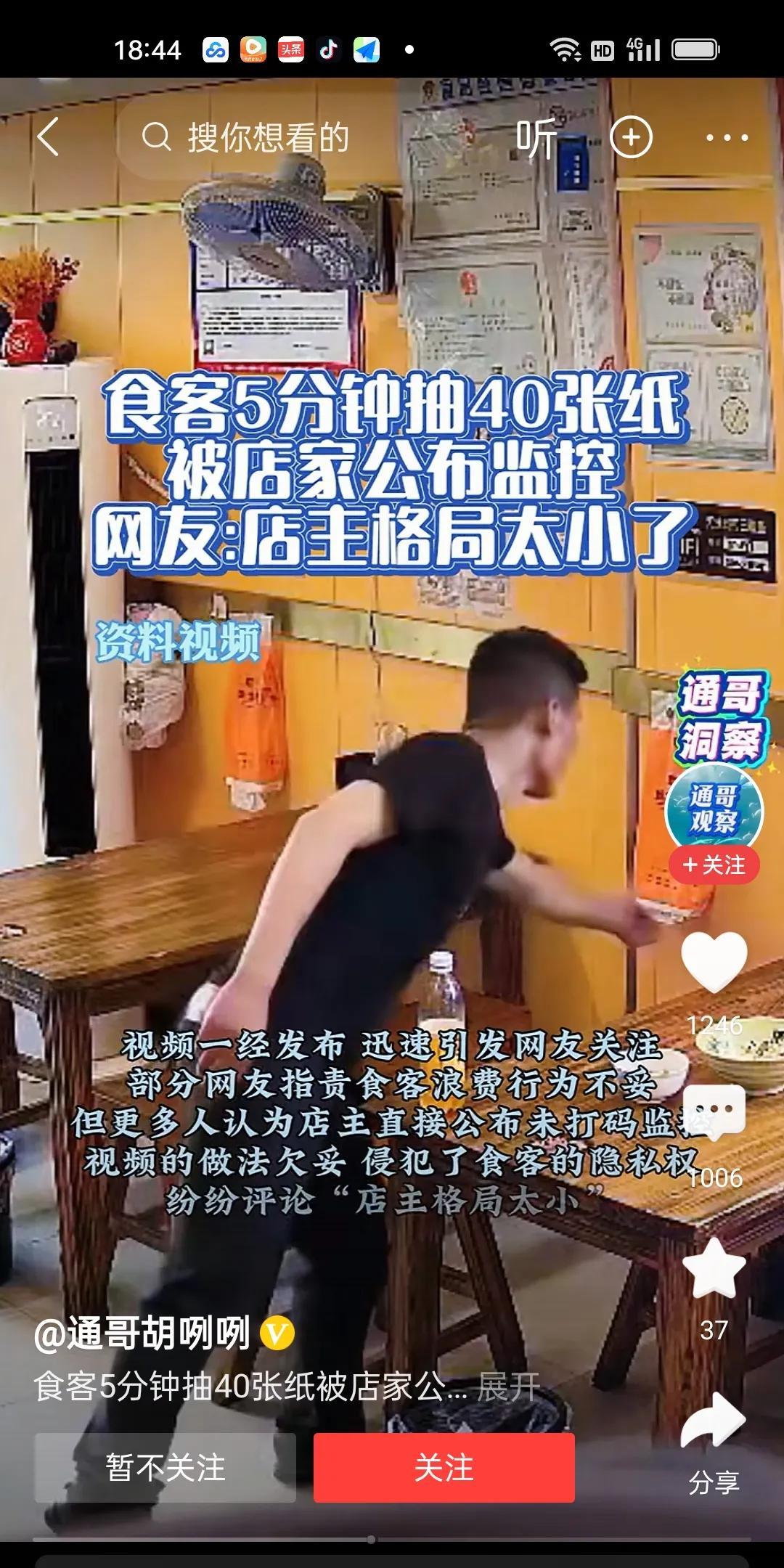 黑衣男子在一家店吃饭,5分钟使用40张抽纸,店主表示很不满,公布了男子使用抽纸的