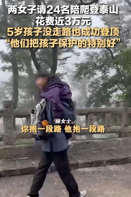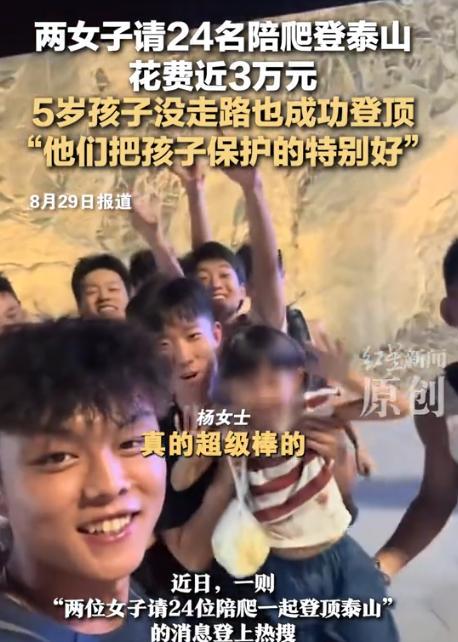 有钱就是任性!山东,两女生嫌2人爬泰山太无趣,于是大手一挥,花费近3万元,请了24位陪爬,一起登顶山峰,而这一路上他们又是扇扇子,又是哄两女子开心的,情绪价值可谓是拉满了! 据红星新闻8月29日报道,两位女士带着一个5岁的小朋友爬泰山,一口气请了24名陪爬人员,整个登顶花费近3万元。这件事一曝光,立刻在网上引发热议,网友们纷纷感叹,也有人觉得不可思议。 咱们先看看这支“豪华登山团”的阵容。 这两位女士带着小朋友,在24位年轻陪爬人员的簇拥下开始攀登泰山。 这些陪爬人员年龄最小19岁,最大不超过26岁,一个个体力充沛、精力旺盛。 他们分工明确:有人帮忙背包、提行李。 有人拿小风扇给女士们降温,还有专门逗乐的,讲笑话、聊天,让登山路上的气氛非常活跃。 最让人惊讶的是,为了让小朋友轻松登顶,几个人轮流抱着40斤重的小朋友走完整段山路,小朋友一路几乎没有踩到地面,安全稳妥地到达了山顶。 当事人杨女士表示,这次出行主要是希望孩子能顺利登顶泰山,亲身感受征服高山的喜悦。 考虑到孩子年纪小,自己体力有限,她就想着多找一些人分担抱孩子的工作,让每个人都轻松一些。 陪爬人员的服务非常贴心,不仅照顾孩子,还在登山过程中教她们一些小技巧,一路上说说笑笑,气氛轻松愉快,让旅行充满乐趣。 杨女士还提到,爬山前,她们请陪爬人员吃了晚餐,途中给他们买水,登顶后安排住宿。 算下来,包括陪爬费用,两人总共花费近3万元。 虽然对于普通人来说,这是一笔不小的开销,但杨女士觉得,为了孩子的体验,一切都值得。 此事在网上引发了激烈讨论,网友们意见不一。 一部分人羡慕不已,评论说:“等我有钱了,我也要这样爬泰山,花钱买快乐,多爽啊!”“这才是真正享受生活,辛苦全被省掉,只留下开心和美好回忆。” 他们认为,如果经济条件允许,花钱让旅行更舒适、愉快,完全没问题。 也有不少网友持不同看法。有的觉得:“这样登山完全失去了意义,爬山本是挑战自我、磨炼意志的过程,被人簇拥着走,还算什么成就感?” 还有人担心,这种行为可能会让大家误以为钱能解决一切,忽略了努力和坚持的重要性。 甚至有人直言,这有点铺张浪费,3万块可以做很多更有意义的事情。 这几年陪爬服务在泰山等景区逐渐流行。 很多大学生利用假期兼职,收费一般在500元到800元之间,夜爬可能会稍微贵一点。 他们不仅帮忙背包、指路,还能带动情绪,让原本枯燥疲惫的登山变得有趣。 对不少游客来说,花钱买开心、买独特体验,也算是各取所需。 人们的消费观念越来越多元化,过去旅游可能更看性价比,现在很多人愿意为个性化、高品质的服务买单。 只要在经济承受范围内,让生活更丰富精彩,也是无可厚非。 你们觉得,这3万花得值吗? 信源:红星新闻
