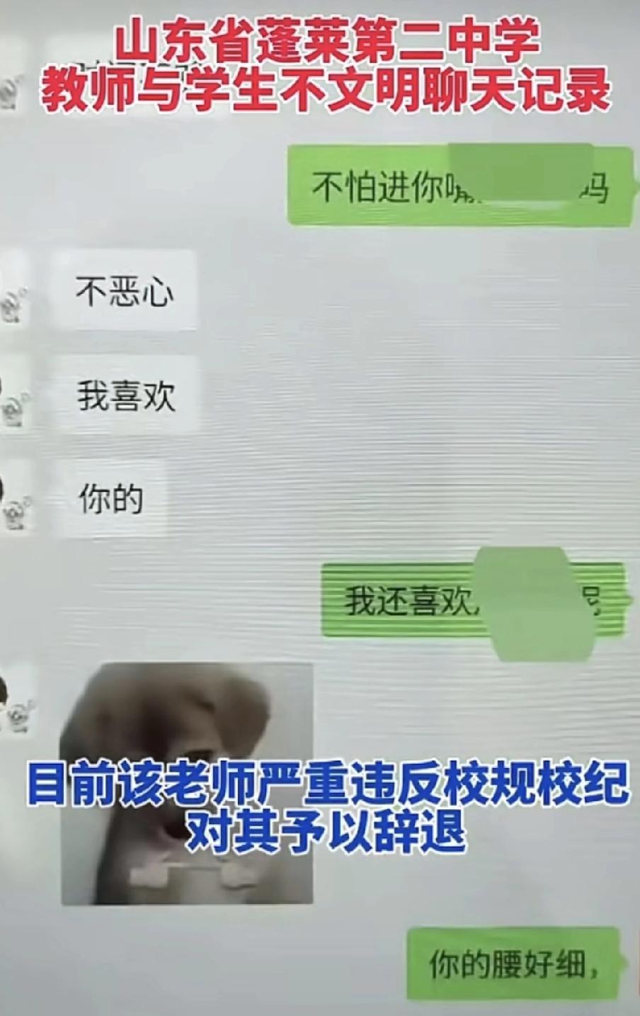 蓬莱二中教师与学生的不雅聊天记录被曝光,该老师已被学校辞退。 教书育人是教师的职