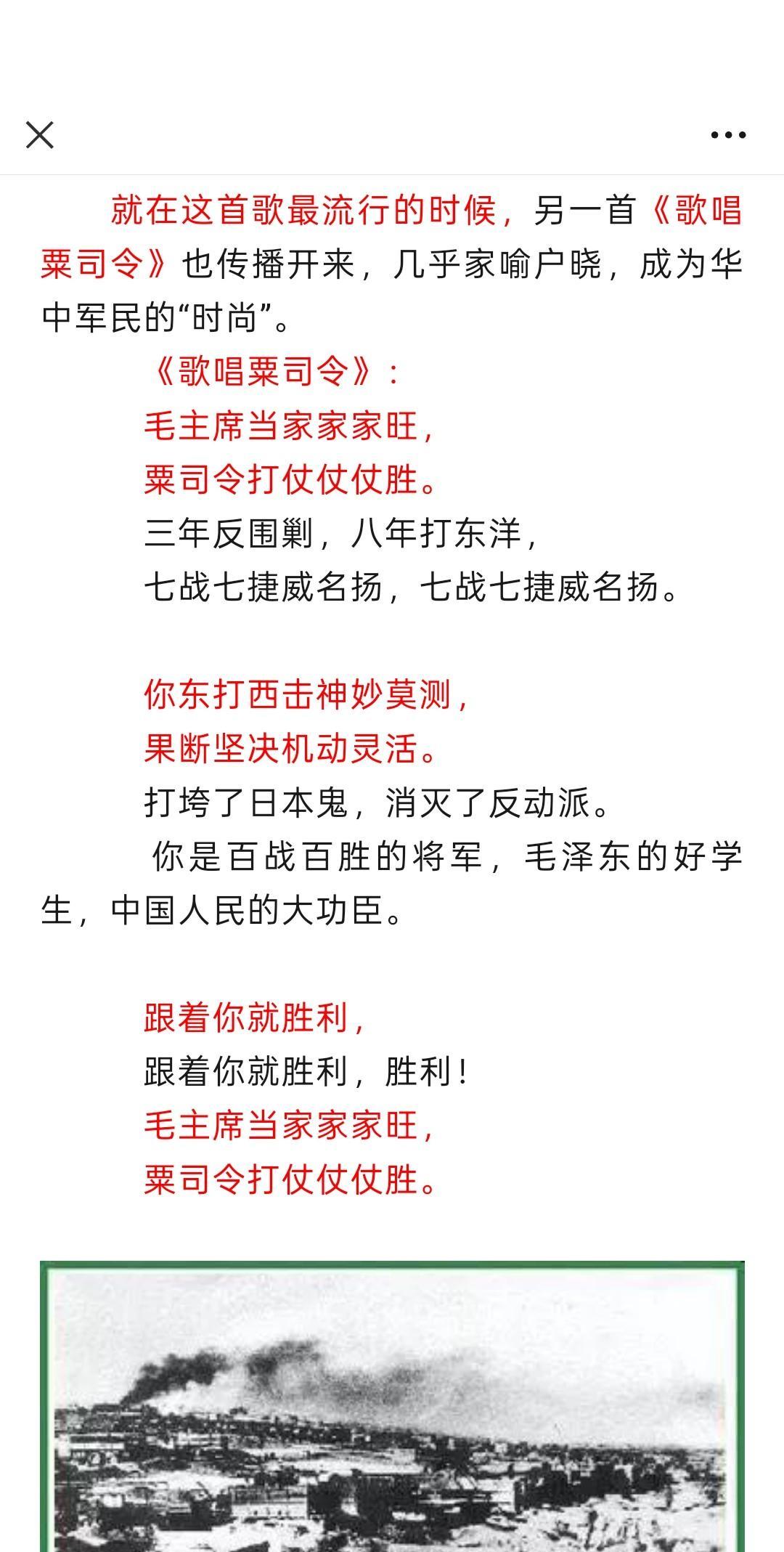 #粟裕# 战争年代歌唱粟裕司令员的三首歌曲。林司令命令往下传歌曲很有名。在新四军和华东野战军,也有歌颂粟司令,粟师长的歌曲。粟司令因为比林总待在战场和前线的时间更久,有整整二十二年,麾下的文艺骨干又多,传唱他的歌曲也更要多一些。 早在1941年6月,刚到苏中不久的沈亚威,就与剧作家沈西蒙一起,写成了颂扬粟裕指挥新四军先遣队,在江南首创抗日“处女战”大捷的《纪念卫岗处女战》一歌。 1944年春夏之交,苏中大地又有了风靡一时的“流行歌曲”--《我们的粟师长》: 苦斗二十年, 你是列宁的忠实学生。 英勇善战果敢顽强沉着坚持, 转战在东南疆场。 虚心学习深入研究, 待人和蔼如同母亲一样; 你勇敢战斗胜如海燕, 不怕狂风暴雨惊涛骇浪, 紧随着毛泽东斯大林。 鹰,在革命的大海上飞翔, 粟裕的名字深刻在人民心上, 千百万军民团结在你的周围, 在你领导下战斗到胜利的明天, 战斗到胜利的明天。 1946年8月,粟裕七战七捷大胜。随后,华中战区开始流行一首抒情味极浓的《粟司令从前线归来》: 黎明静悄悄,晨星在闪耀, 百里夜行军,天明要宿营。 军号阵阵吹,队伍进了村, 小路的尽头来了一支神奇的兵啊! 骑在马上的他是谁? 粟司令从前线归来。 他那锐利的眼睛望着远方, 他将带领我们出奇兵。 跟着他去战斗一定胜利! 跟着他能防守更能进攻, 跟着他去战斗一定胜利歼灭敌人, 也壮大了我们自己,我们自己。第三首《歌唱粟司令》更是传唱很广: 毛主席当家家家旺, 粟司令打仗仗仗胜。 三年反围剿,八年打东洋, 七战七捷威名扬,七战七捷威名扬。 你东打西击神妙莫测, 果断坚决机动灵活。 打垮了日本鬼,消灭了反动派。 你是百战百胜的将军,毛泽东的好学生,中国人民的大功臣。 跟着你就胜利, 跟着你就胜利,胜利! 毛主席当家家家旺, 粟司令打仗仗仗胜。