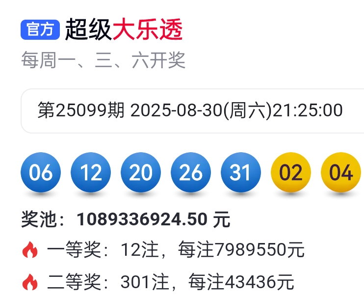 家人们!今天大乐透25099期开奖啦,这可是八月最后一回大乐透开奖哟!说不定好运大奖就跟长了翅膀似的,趁着八月末尾一下子就飞到咱们身边啦,到时候咱就一夜暴富咯! 今儿个前区开出来的号码是6、12、20、26、31,后区是2和4。 这期全国一共中了12注一等奖呢,每一注奖金可有798万这么多!这可是好大一笔钱呐,都够好几辈子花啦!而且这12注一等奖都没选追加。这些中奖的地方可分散啦,北京有1注,河北有1注,江苏有2注,浙江有1注,江西有1注,广东有2注,陕西有1注,甘肃有2注。也不知道这些幸运儿都是谁,说不定就是咱身边的人呢! 二等奖开出了301注,每一注奖金是4万。这里面有78注选了追加,追加之后每一注能再多拿3万呢。你想想,要是选了追加,一下子就多赚好几万,多划算呐! 这八月最后一期大乐透,也不知道家人们有没有人中大奖。说不定你就是那个隐藏的幸运儿,喜提大奖走向人生巅峰啦!大家都来评论区聊聊,分享分享自己的中奖情况,没中奖的也来沾沾喜气,说不定下次好运就轮到你啦!