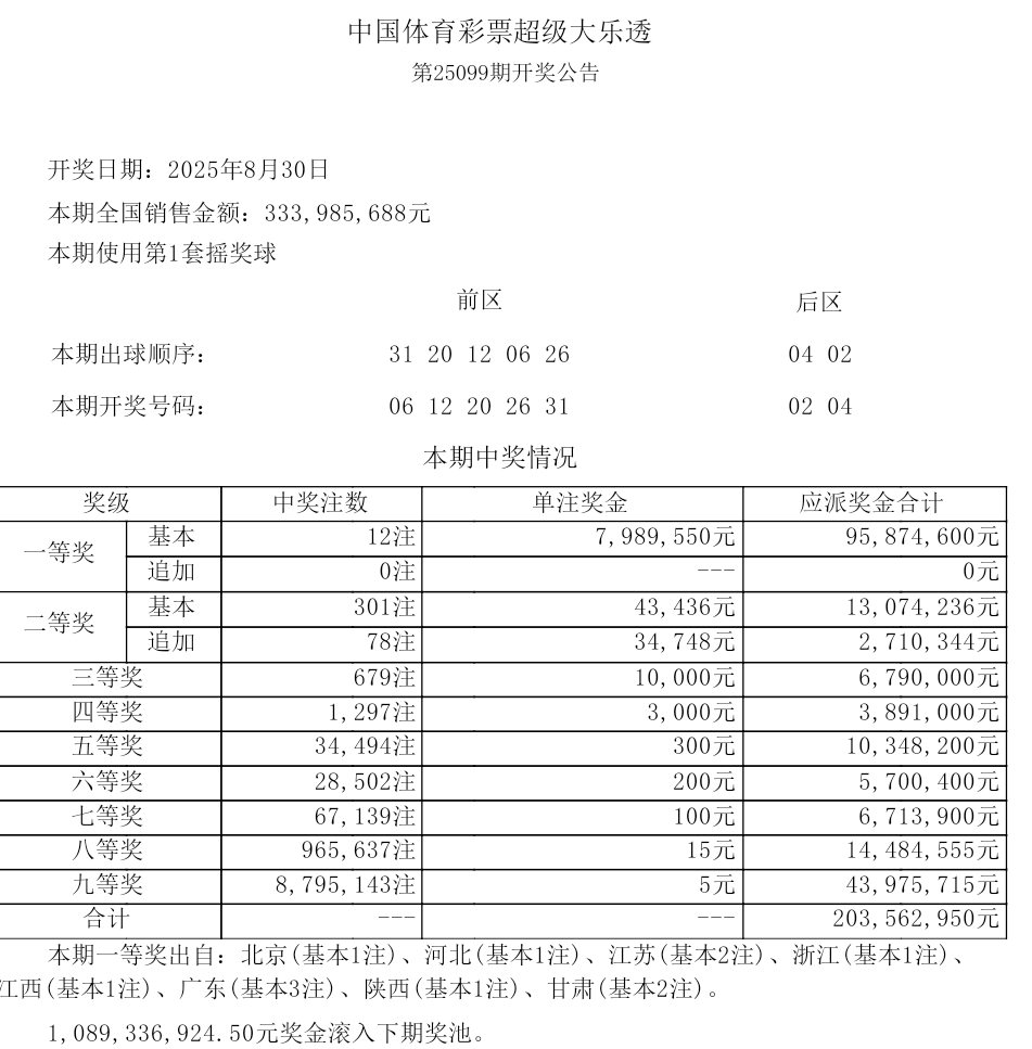 大乐透25099期一等奖开出12注,单注奖金798万元,你中了没?