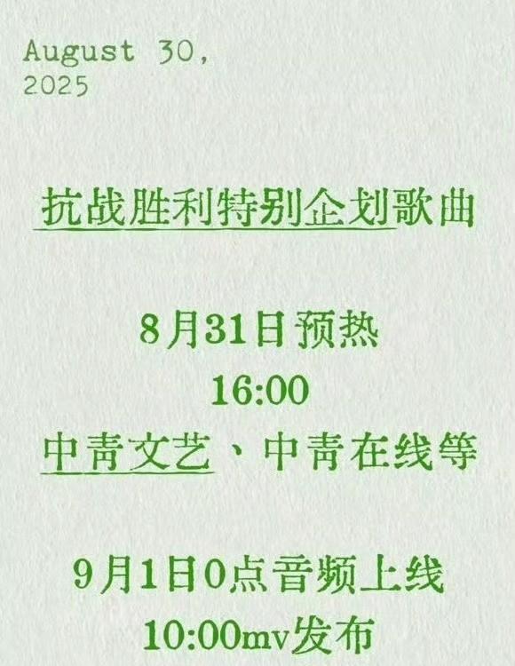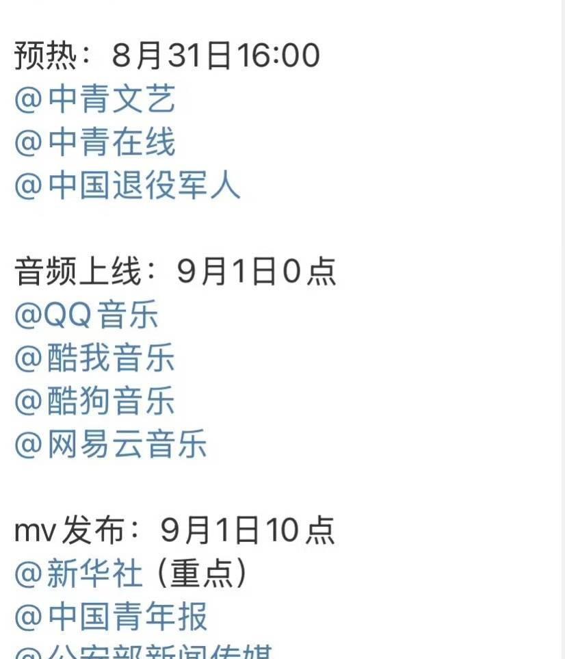 王一博又添一首新红歌, 我一直有感觉,一博一定会有新的红歌,竟然成真了。 经过多方求证,确实这样,抗战胜利特别企划歌曲。 8月31日16:00预热。 9月1日0点新品上线!可以听了(见图三)。10点发布MV。 我们一博是国家严选的红歌小王子。看图四,一博竟然唱过这么多首红歌了。 9月3日,我们不仅可以看到大阅兵,还可以听王一博唱的红歌,更可以走进电影院看《长空之王》。 作为王一博的粉丝总有自豪感。 #今日所见所闻# #王一博红歌#