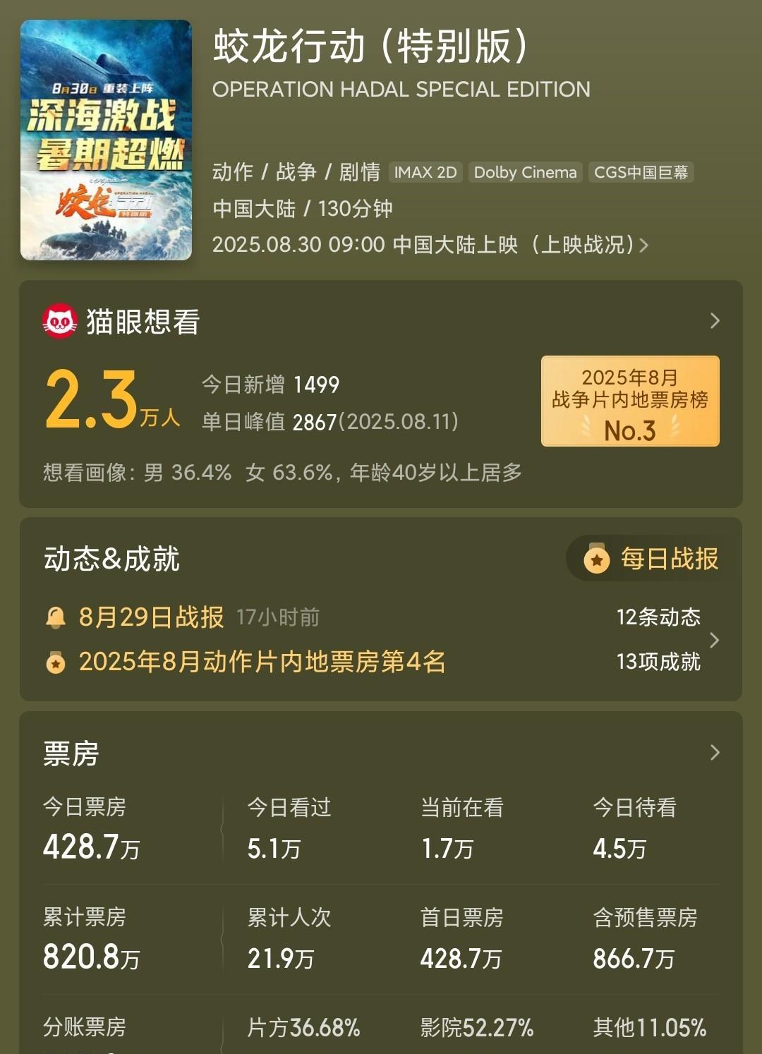 《蛟龙行动》特别版今日上映,不知看到重映票房,于冬是否会后悔撤档?今日预测全天票