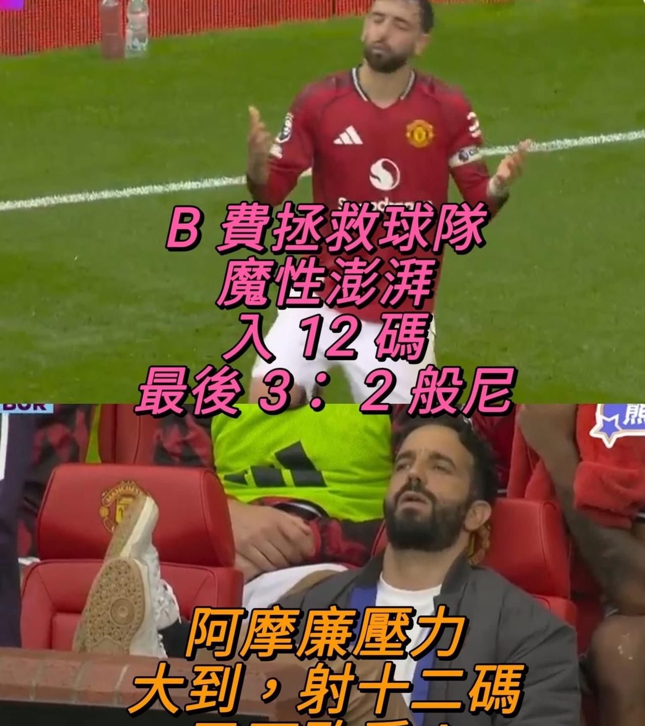 恭喜曼联以3比2战胜升班马伯恩利,真的是一场得来不易的胜利啊。不过,堂堂红魔,面对升班马居然也要陷入这般苦战...... 开心的是赢球,难过的是,居然已经沦落到这样了。 B费顶住压力,上轮因为罚丢点球被喷上天,此役将功赎罪,通过点球绝杀,完成了救赎! 伯恩利的表现值得称赞,两度落后两度扳平,曼联真的拿大力手抛球没有任何办法,伯恩利的球每次进入到禁区,感觉威胁都很大。 其实,这场比赛本该在上半场就打花,曼联至少浪费了两次绝佳机会,其中阿玛德一个近在几尺的空门居然打飞,真的无言。 不管怎么说,赢了就是赢了,恭喜红魔! 看到阿莫林最后的样子,真的有点心疼啊......