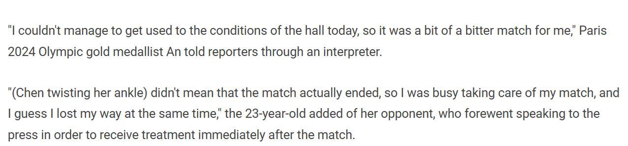 韩国羽球女皇安洗莹正面回应了为什么世锦赛女单半决赛输给陈雨菲。她对风向和灯光都很不满意:“我今天始终无法适应场馆条件,所以打得很别扭。”对于陈雨菲脚踝扭伤,安洗莹坦言自己专注于自己,并没有把心思花在陈雨菲崴脚该怎么应对上:“现在回忆起来,我当时有点乱了节奏。”有一说一,安洗莹确实没有针对陈雨菲的伤脚采取针对性战术,就是正常来打,高手之间彼此尊重惺惺相惜。#安洗莹#
