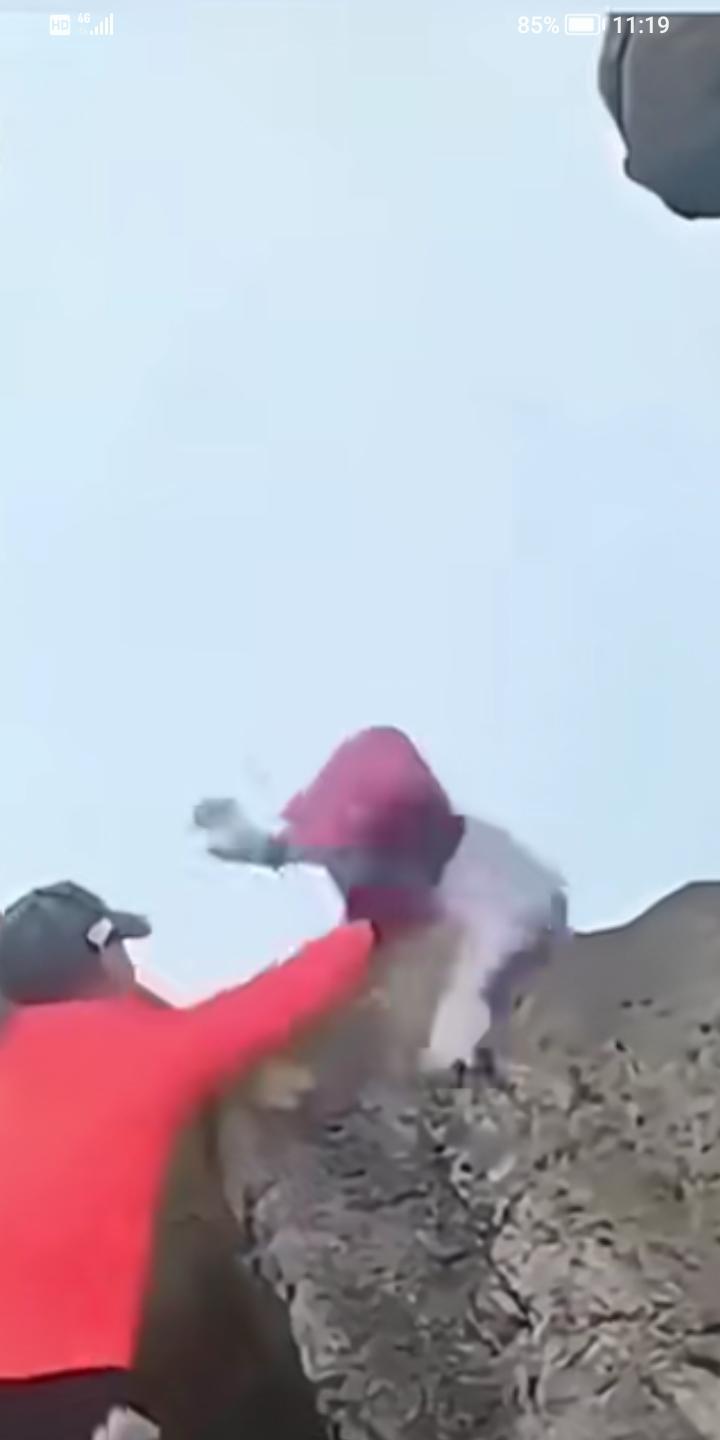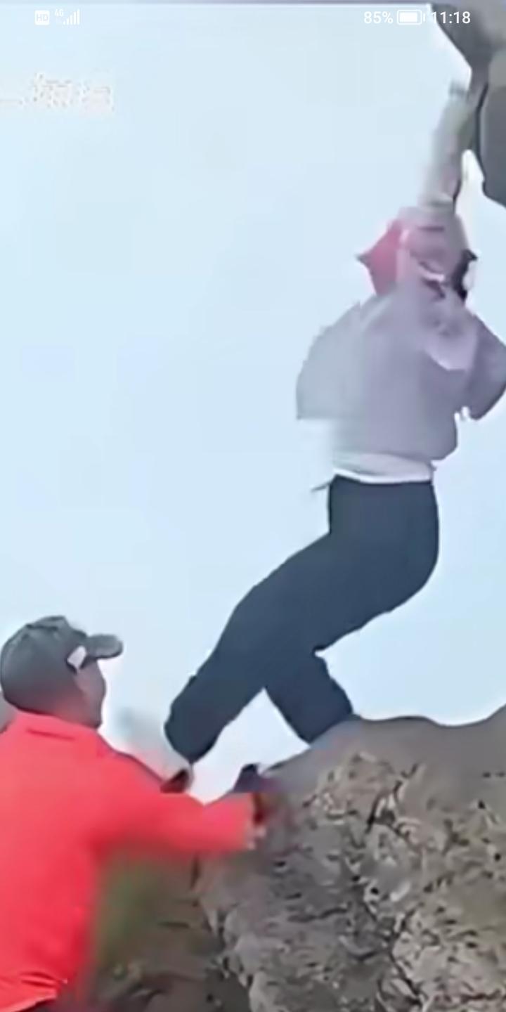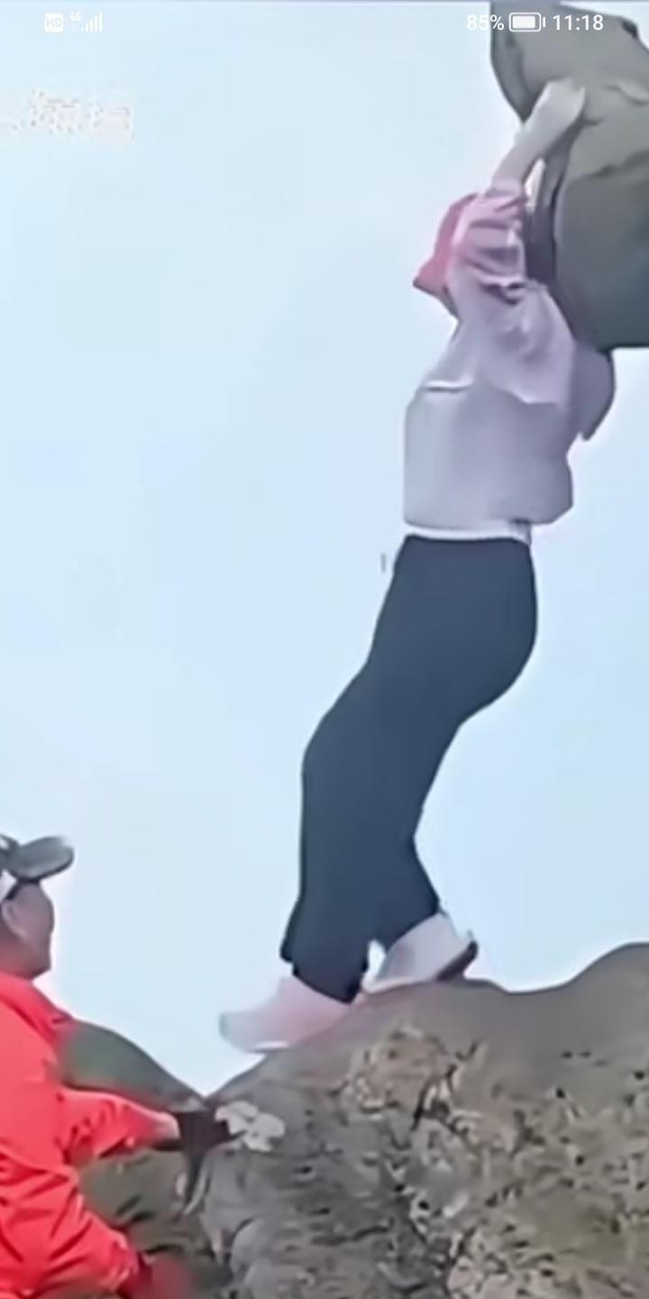 不得瑟了吧!命都丢了,一女子在山上想抱着一块突出的石头拍照,别人劝她说危险,她说