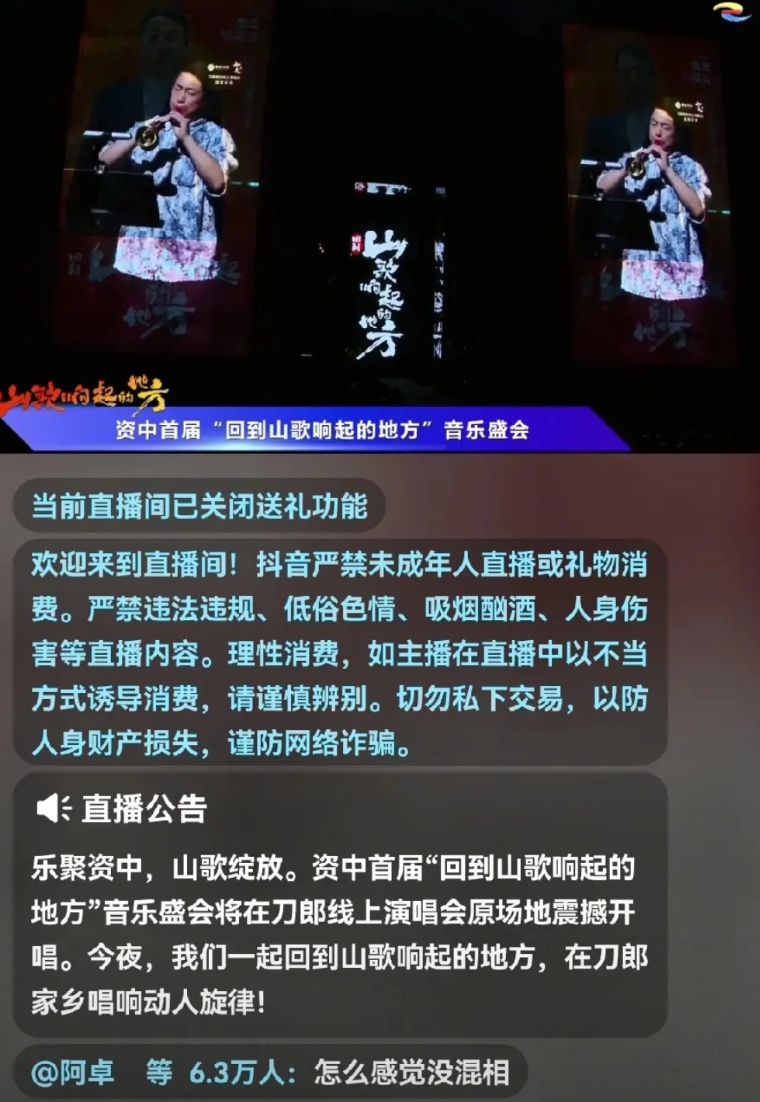 对这场演唱会,刀郎绝对很无可奈何。 回到山歌响起的地方,资中文旅蹭刀郎的流量应该,但似乎有点几不像。 1,舞台上来自全国各地的刀迷,演唱刀郎的歌曲本来是一件非要高兴的事,但主办方却非要搞阶层文化,对观众搞排座次,这未免有点太官方了。 2,可能因为是免费赠票,入场的观众中不一定都是刀迷,他们看得也累,而有些真刀迷可能因无门得票而入不了场,到处刷直播追得也累。 3,资中文旅作为直播的主帐号,几十万人在线,所看的画面似乎都是大场景,很少表演者的特写镜头,拍摄技术还不如观众席里开直播的看得过瘾。 4,这次资中文旅线上直播,关闭了打赏功能,这个到和刀郎的精神完全一致,值得赞赏。