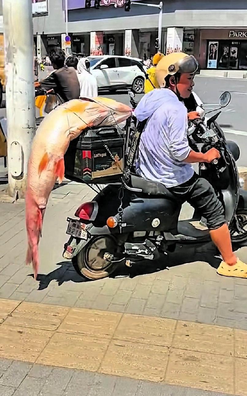 逛街时,瞧见一位大哥的电动车后尾箱上绑着一条大鱼。 他在街上绕了好几圈,有人问他