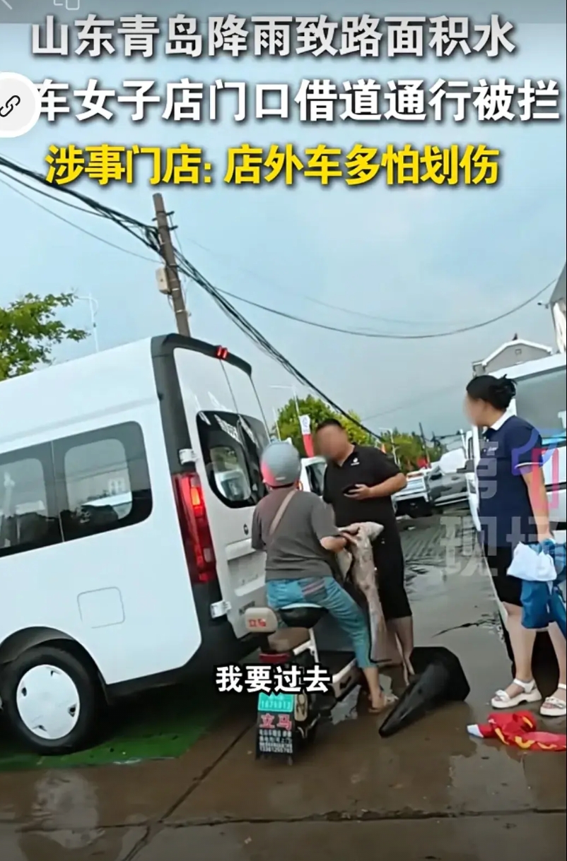 青岛又躺枪了。 8月29日,山东青岛降雨致路面积水,一骑电动车女子通过店门口借道通行,被汽车销售店员工拉线阻拦,女子解释路面积水无法通行,想骑车通过被门店员工强行拦着,为此双方发生纠纷。 马路什么时候成私人领域了?这和地痞流氓,车匪路霸又有什么区别,这是在侵犯人民公共资源,阻碍社会交通。按常理来说,哪里能走就走哪里,你开店的范围只是店里面,门外都是公家的,都是公共资源,每个人都享有路权。但凡善良一点都干不出这不是人的事,你说是你家的,如果在门外摔倒你们负责吗? 网友说:这家店格局小了。 要我说这跟格局没关系,是人品问题,是坏到骨子里了。 像这种店,建议不要进他们店消费,他开到哪里以后都不要去他店,认准这家店到哪都不要去消费。 大家对此有什么看法?
