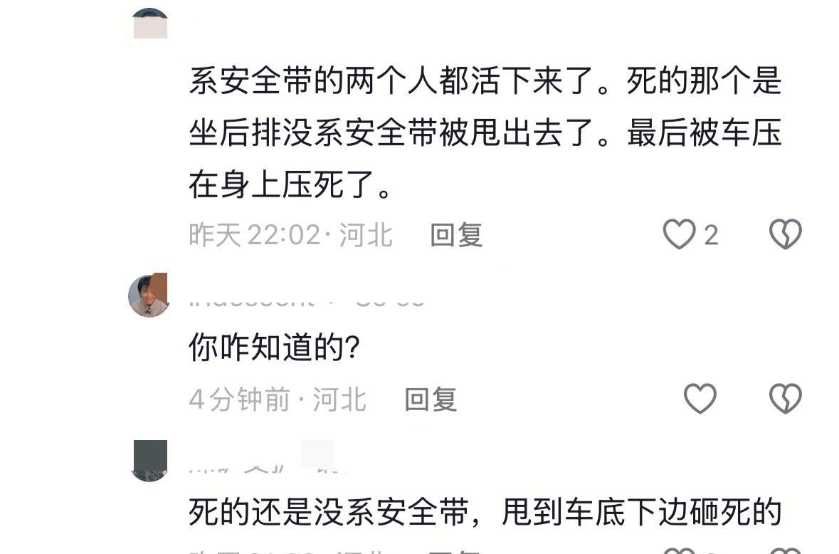 坠崖越野车大概率是不熟悉路况冲下去的,坠落的位置是很高的一处断崖边上。如果了解到这个地形,应该早就会减速停车了。 参与救援的一位志愿者,通过现场分析他们当时是想冲坡的,只是没想到前面是很高的断崖。 悲剧是8月29日下午发生的。 事发当天,三名年纪相仿的男子坐着同一辆越野车来到了蔚县一处景点游玩。他们都是徐水人,其中两个还是表亲。 一路上,大家有说有笑,殊不知,悲剧竟会突然降临。 车子坠落的的一瞬间,后排男子由于没有系安全带直接被甩出了车外,之后被重重的压在了车下。 最终,司机和副驾驶都一一获救,只有他因为伤势严重离开了。他才22岁,或许还没有来的及娶妻生子。更让人泪奔的一点是,他同村的人透露,他爸爸妈妈就养了他这么一个宝贝孩子啊! 这么年轻的生命,就这样离开了,实在是让人无比遗憾!剩下两名男子虽然有幸捡回一条命,但也是损失惨重,车主则更甚。车子坏了不说,接下来还要面临不少的赔偿问题。最关键一点是,发生了这种事情,他内心的愧疚可能会伴随终生。 希望通过这个悲剧,能够警醒大家:凡事都要多加注意,去到不熟悉路况的地方,一定要慎之又慎。最重要的一点,别忘了系上安全带![祈祷][祈祷][祈祷][祈祷]