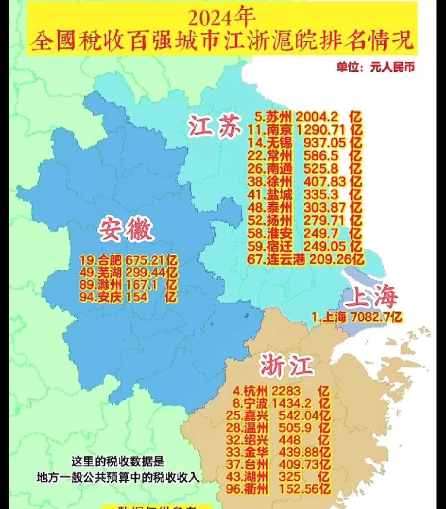 长三角三省一市税收情况一看,万亿之城2024年的税收情况分别是: 上海7084.