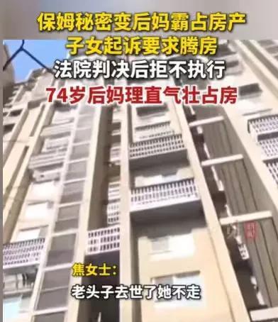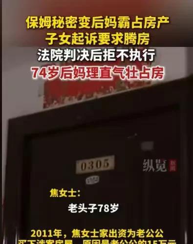 北京,女子的老公公将近80岁了,被一个女子骗走了15万的养老钱,女子可怜老公公,看着老公公没钱了,又没有地方住,就给老公公买了一套房子,结果老公公找了一个保姆,女子担心老公公又被骗,但老公公承诺他不会再结婚的,女子才放心把房本交给他,结果保姆变成了后妈,女子的老公公离世后,这个保姆就一直占着房子,不愿意搬出来,她索要30万才愿意搬走。 2011年,焦女士看着将近80岁的老公公,被一个女子骗走了15万的养老钱,他一个人蜷缩在角落中,看起来实在是可怜。 其实老人老了,希望有个老伴陪他安度晚年,老人的这点小心思,焦女士是很理解的,她看着老人可怜的样子,钱被骗没有了,住的地方也没有了,心软的她就和丈夫商量给老人再买一套房子。 他们家境不错,要买一套房子也不是什么难事,更何况这是儿子儿媳应尽的责任,他们也要赡养老人。 他们说买房子,就给老人买了一套房子,买了房子之后,老人有地方住了。 住的地方有了,老人的生活却还没有着落,老人觉得自己年纪大了,没有保姆照顾自己的生活,他的晚年也一样艰难。 他提出要求要找一个保姆,这可吓了焦女士一大跳,老人又要找保姆了,到时候一结婚,又要被骗了。 他们赶紧劝老人不要找保姆,但老人口口声声承诺,他是不会和保姆结婚的,他只找个保姆照顾他。 看着老人态度如此坚决,焦女士想着老人已经吃了一次亏了,应该不至于还会老糊涂,再被骗一次,她相信了老人,于是给老人找了一个六七十岁的保姆。 老人有了房子住,又有了保姆照顾,日子过得美滋滋的,再也不怎么打扰焦女士的生活了。 焦女士没有了照顾老人的烦恼,她和丈夫也过得轻松自在多了。 大家相安无事,开开心心生活了六七年,焦女士看着老人年纪越来越大了,于是就着手房子过户的事情。 这个时候他们却发现了一个大秘密,她的老公公竟然和保姆结婚好几年了,在2014年,她的老公公就和保姆领了结婚证。 得知这个消息,焦女士真的很惊讶,但她很快就反应过来,为什么保姆要在2014年结婚。 原来焦女士买的这套房子,是在2013年才下来房本的,保姆没有在之前和老人结婚,目的很明显,在老人什么没有的情况下,她结婚没有什么好处,房本下来了,老人有房子了,她和老人结婚才有意义。 得知老人已经和保姆已经结婚好几年了,此时焦女士再说老人也无济于事,她只好默认了这件事的存在,但老人和保姆结婚却埋下了隐患。 老人毕竟将近80岁了,什么时候离世,都是说不定的事情,在他和保姆结婚后没几年,老人还是离世了,留下了房子和保姆。 本来这个时候,焦女士就可以把保姆赶走,毕竟房子是她买的,并不是老人买的,老人离世了,她就可以要回房子。 可是保姆以自己是老人的妻子自居,坚持不搬走,一直霸占着房子,一占就占了很多年。 焦女士也是个心软的善良人,看着保姆也70多岁了,也不敢强硬地把她赶走,后来只好申请强制执行。 但是保姆索要30万,只要给她30万,她才愿意搬出房子。 焦女士很无奈,她和这个保姆没有任何关系,却因为保姆和她老公公领了一张结婚证,就有这么多的麻烦事。 那么焦女士该怎么要回房子呢? 首先,焦女士的老公公和保姆结婚之前,房本还没有下来,房子又是焦女士买的,那么这套房子就不是保姆和老人的夫妻共同财产。 既然不是夫妻共同财产,那么保姆就不能占有房子,如果她一直占有房子,这就是侵占罪。 《刑法》第270条规定:侵占罪是指,将代为保管的他人财物非法占为己有,数额较大,拒不退还的,处二年以下有期徒刑、拘役或者罚金;数额巨大或者有其他严重情节的,处二年以上五年以下有期徒刑,并处罚金。 虽然保姆已经70多岁了,可能受到的刑事处罚很轻,但不是自己的东西,就不应该霸占。 其次,老人要和保姆结婚,这是他的权利。 《民法典》第1041条规定:实行婚姻自由、一夫一妻、男女平等的婚姻制度。 虽然老人可以和保姆结婚,但保姆的目的显然为了房子去的。 那么你觉得姜女士应该赶保姆出去吗?#头号创作者激励计划#