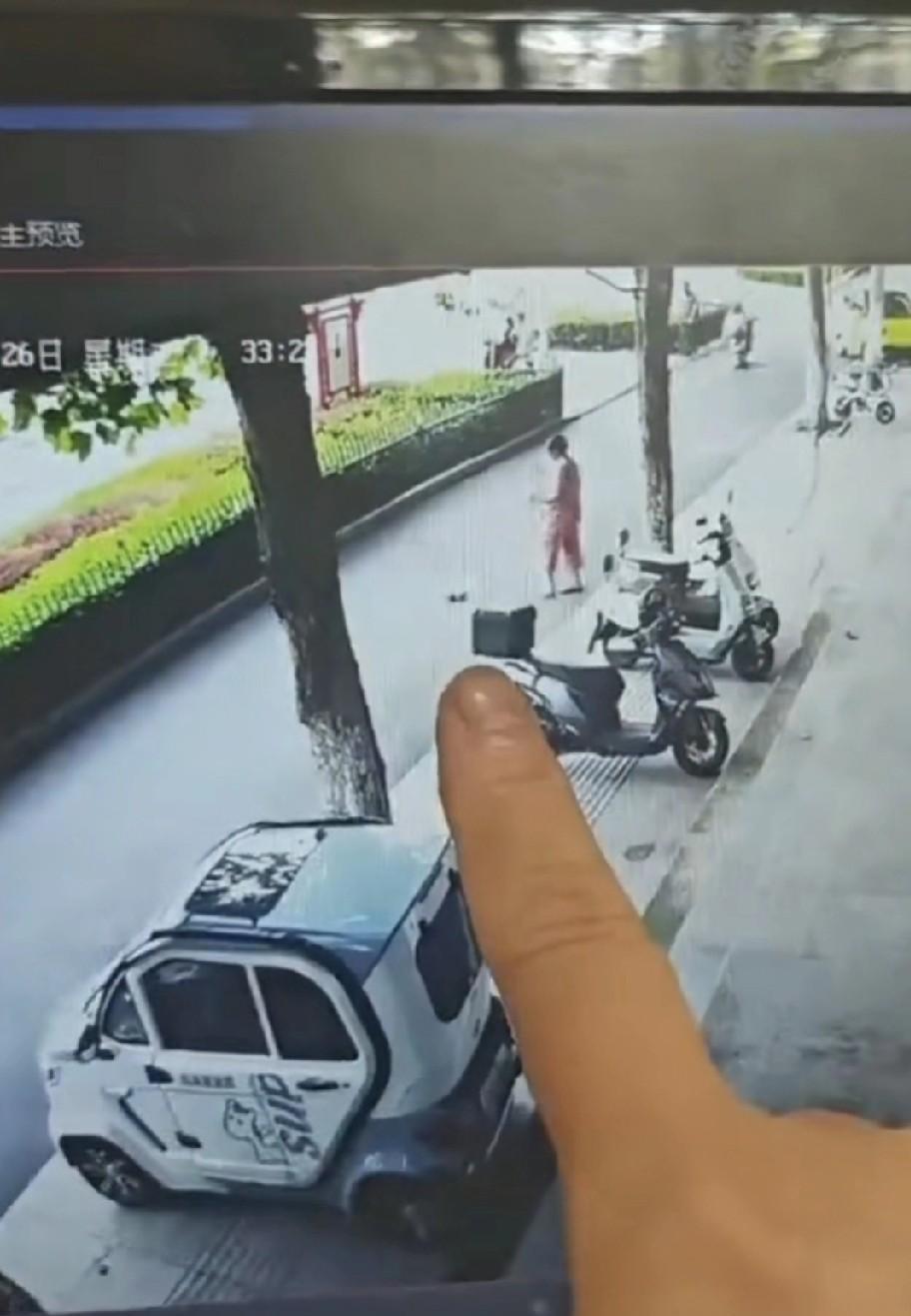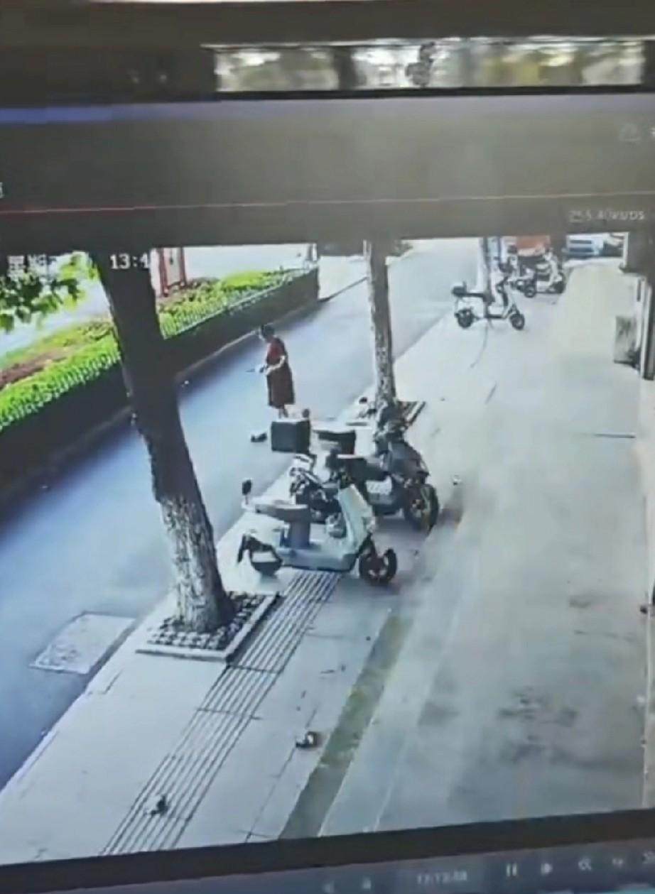 监控视频显示,一位老太太连续多日将砖头踢到马路中间。8月26日5点左右,老太太在