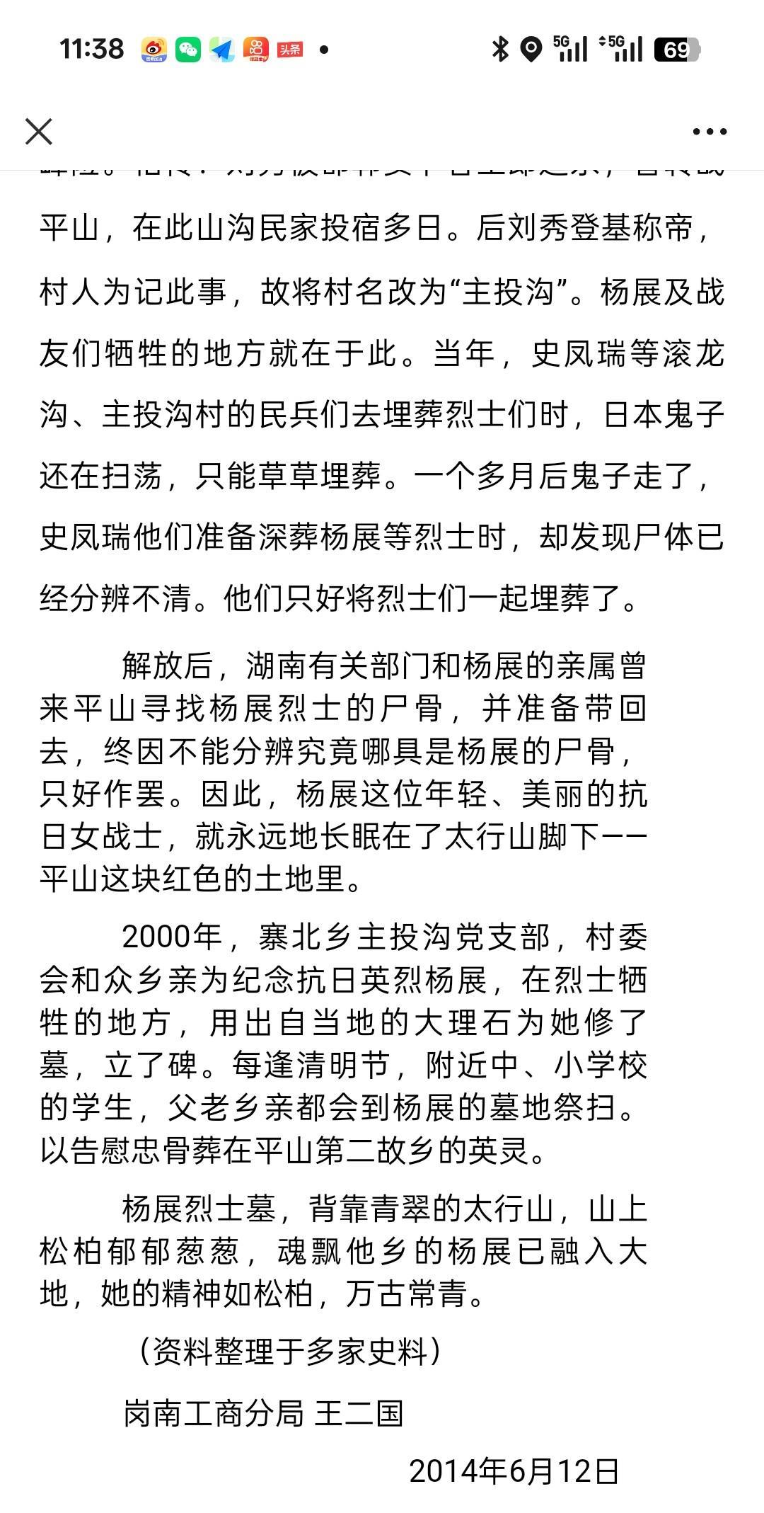 #7.7万余座零散烈士墓迁至烈士陵园#这是非常好的政策,让灵星孤单的烈士墓,聚集在一起,让维护更加到位,更方便人民群众去缅怀纪念,也让烈士不再孤单。小时候,我们几乎每年清明节前后,到株洲市石峰区白马垄黄子日烈士墓去扫墓。这个烈士安葬在一个水库旁边,只有孤单一人。由于维护不方便,我们每次去扫墓,都要寻找很久。不知道黄子日烈士墓是否要迁至烈士陵园。还有杨展烈士。杨展是杨开慧和主席的侄女,开慧是杨展的亲姑姑。抗战爆发以后,十几岁的杨展跟随南下支队投奔延安参加抗战,结果牺牲在抗战前线。她的遗体就地掩埋在大山里。湖南和平解放后,杨展烈士的父亲杨开智询问伟人,杨展怎么样了?伟人回答,她已经在几年前牺牲在抗战前线了。杨家出了三个烈士:杨开慧,杨开明,杨展。杨开慧的父亲,杨展的爷爷,就是原北京大学著名教授杨昌济。杨家多人参加革命和抗日,是英烈之家。有志愿者希望能够将她移回长沙,跟她姑姑杨开慧在一起,或者将烈士墓迁移到规模更大的烈士陵园。希望杨展墓也能够早日迁移。#抗战胜利80周年#