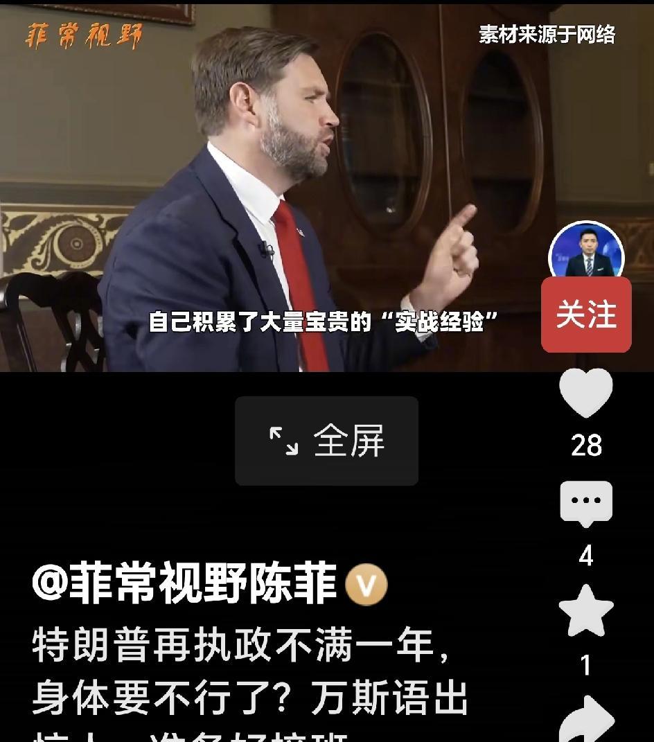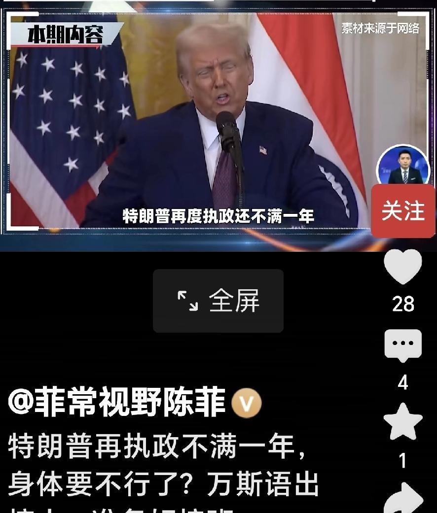 特朗普总统近来有些不好的传闻。说他几天不公开露面,也停止对外发声了。说他手上的青斑与当年英国女王去世前的很相似。还有说万斯已准备随时接班。 我真诚希望这些传闻都是子虚乌有,祝愿特朗普安然无恙,把第二个任期干完。因为我对特朗普的个性和做法虽也有些看法,但总体上还是喜欢他的。 首先他对中国能有今天的强盛客观上是有些帮助的。特朗普第一任期迫不及待地发动了对中国猛烈的贸易科技战,让中国有些措手不及,可也尽早地唤醒了中国。于是便有了危亡意识和奋起直追的紧迫感,避免了被美国温水煮青蛙的可怕结果。从这方面来说,特朗普对中国虽不是相辅相成,但也起到了相反相成的作用和效果。只要客观上对中华民族振兴起了促进作用的,不管他是谁,也不管他的主观动机是什么,都应该感谢他,给他个嘉奖。有机会请他来吃顿饭,喝瓶飞天茅台酒。就像当年招待尼克松总统一样。 特朗普各项政策法令的目的非常明确,毫不掩饰,就是要收割普天下的钱财来继续养肥美国。他不搞东西方阵营对抗,也不热衷于意识形态领域的斗争,不搞阴谋颠覆,和颜色革命之类。今年中国在这方面所费的口舌,和遇到的麻烦似乎少了点。 特朗普有股不服输的劲头,年近八十力挫群雄,成功复辟,二进白宫。他的理想就是要让美国再次伟大。为尽快实现此目标,他认准只有无情收割全世界的财富来拯救衰败中的美国。他像堂吉诃德匹马单枪斗风车,拼命挥舞关税大棒,不惜与所有国家撕破脸皮,争夺利益。紧张的思虑和繁忙的工作,必然会耗费特朗普的精力,损害了他的健康。相信美国拥有世界上最先进的医疗保健系统,一定能确保特朗普总统平安无事,保证他有足够的能力顺利完成他所担负的重大职责。 万斯还年轻,来日方长。 #分享今日趣事#