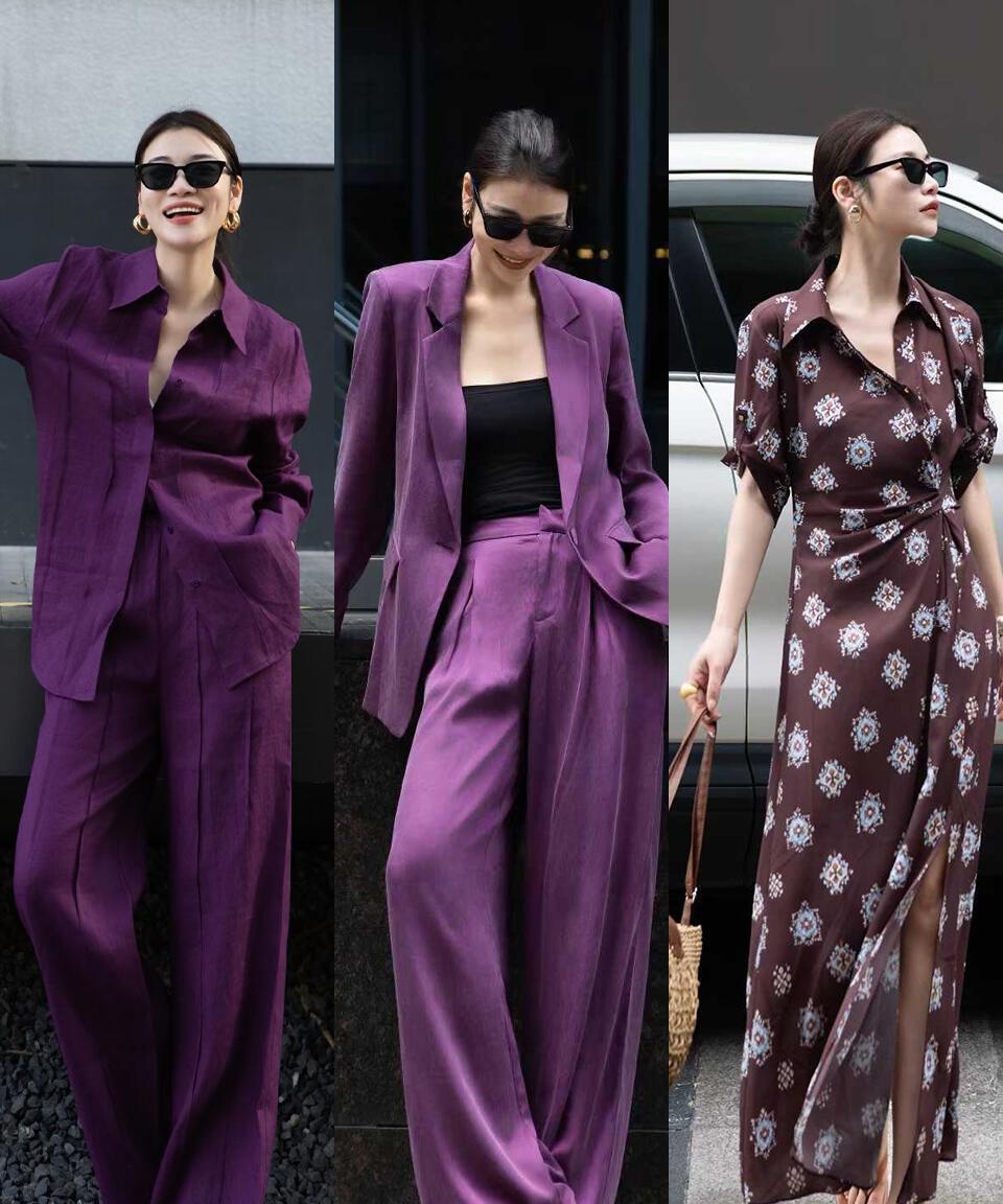 秋天穿紫色远比你想象中更加的惊艳!紫色系穿搭神秘优雅又贵气,非常适合熟龄的姐妹们。 秋季非常推荐光泽感的紫色单品,像缎面连衣 裙、衬衫都很值得入手,可以应对通勤约会各种场合,简约又大气!