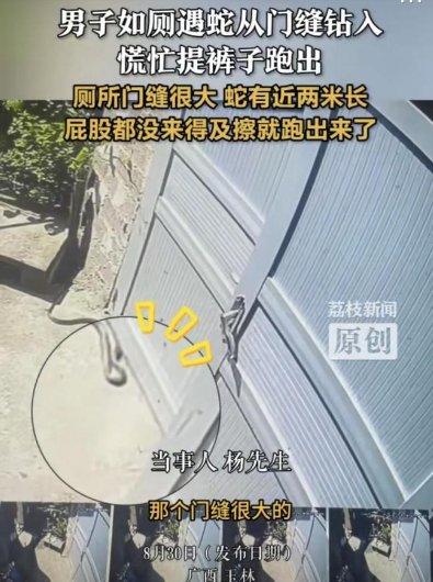 一开始蛇被厕所的门挡住,在门口来回晃悠,东钻西钻,似乎想进去凉快一下。没想到厕所的门缝比较大,蛇就顺势钻进来了。男子一抬头,正好看见那条蛇昂起脑袋,蛇头一抬的那一刻,他整个人直接吓傻了,连屁股都没擦,就慌慌张张提起裤子往外跑。