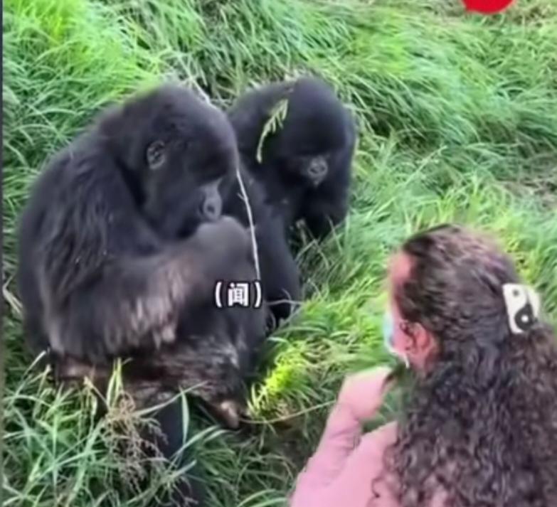 动物园里面,一只黑色的公猩猩看女游客在对着它拍照,一把抓住女游客的头发,把女游客往身边拽,女游客没有惊慌,也没有往后挣脱了,只是顺从黑猩猩,这时旁边一只雌猩猩发现了公猩猩的举动,就顺着草坪滚过来了,这只黑色的公猩猩看到雌猩猩过来了,赶忙将抓女游客头发的爪子松开,并把爪子放在鼻子下面闻了闻。